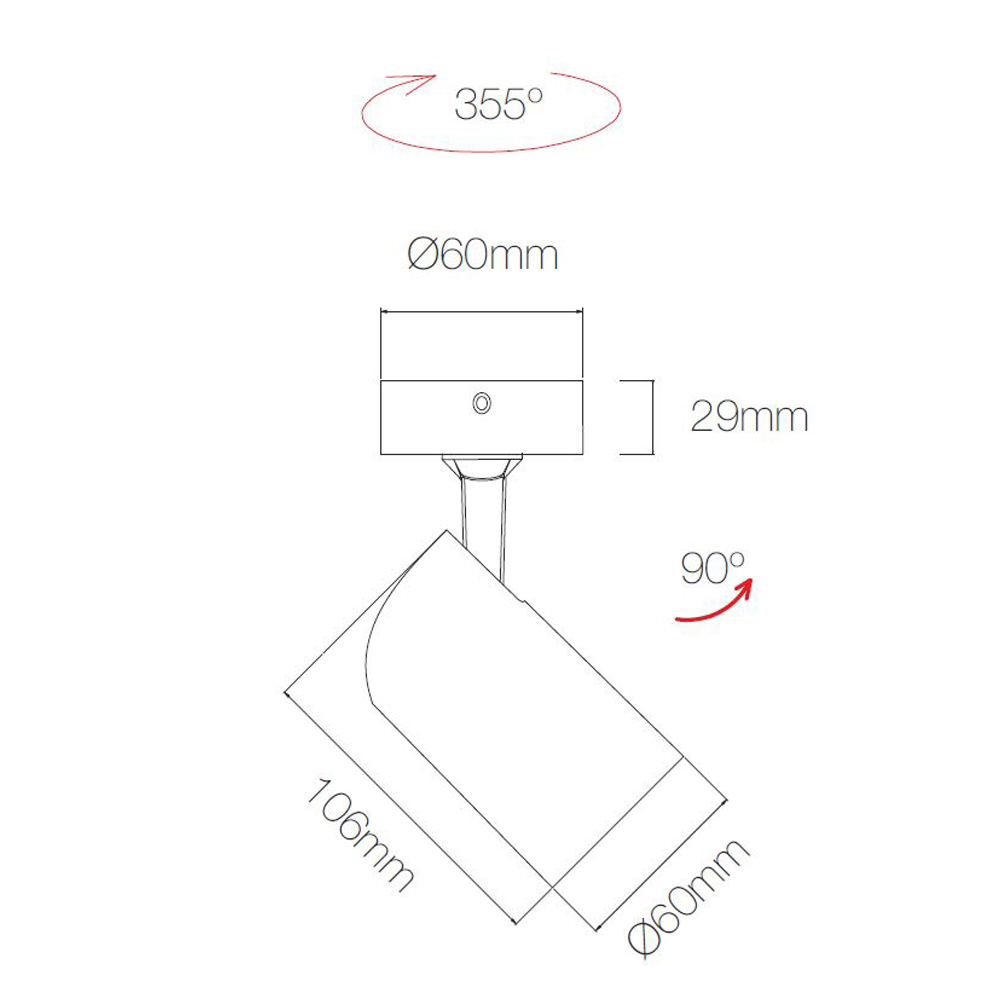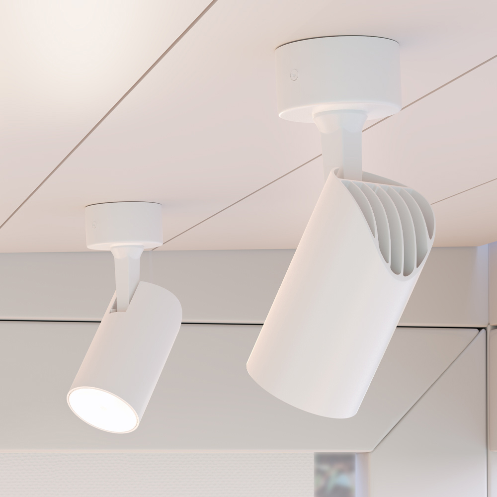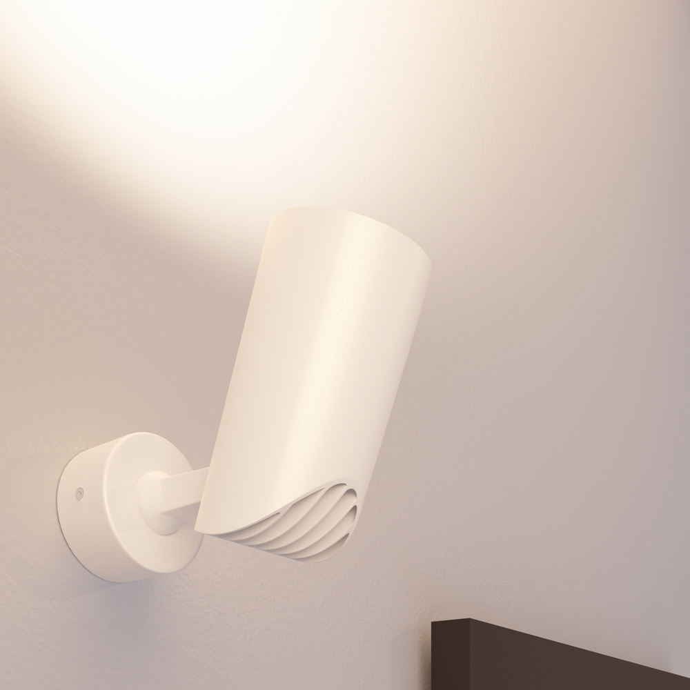aluminiu alb sau negru cu structură reglabilă la 90 ° și reglabilă la 355 °. Un mic proiector deosebit de versatil, care este