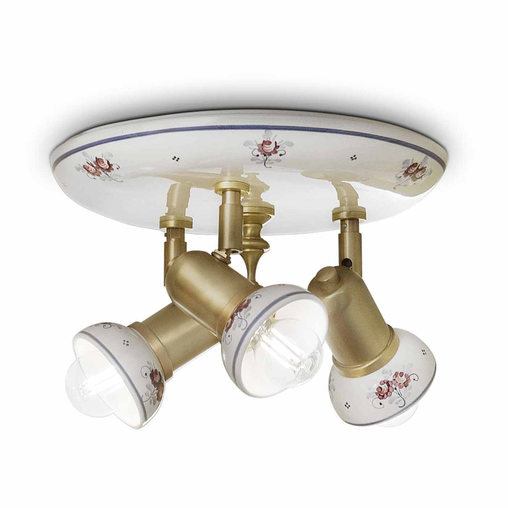Plafoniera rotunda cu 3 lumini din alama si ceramica pictata manual, realizata in Italia de Ferroluce.