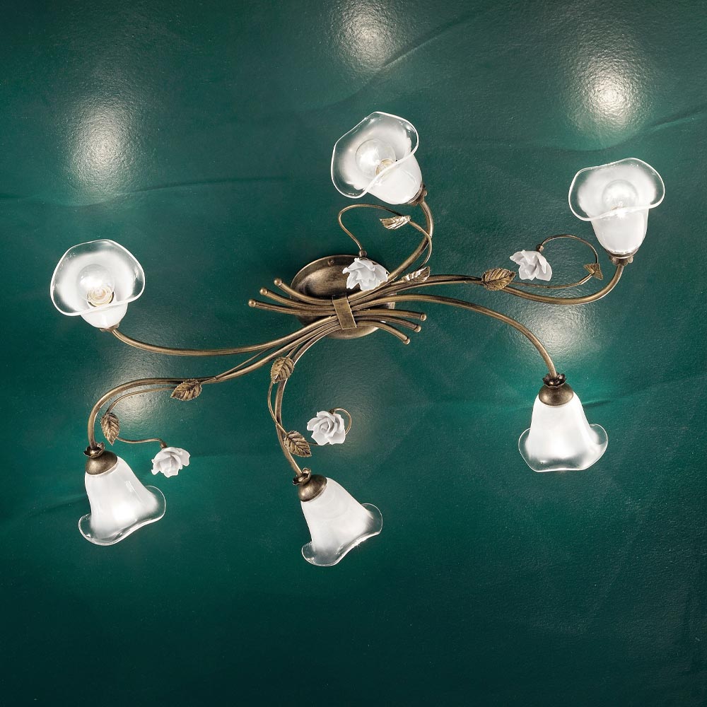Această plafonieră cu 6 lumini este realizată în întregime cu o structură metalică care amintește de ramuri cu frunze și abajururi din sticlă sablata umbrită cu decorațiuni lucrate manual în formă de trandafiri ceramici , pentru a evidenția măiestria și abilitățile manuale ale artizanilor.
