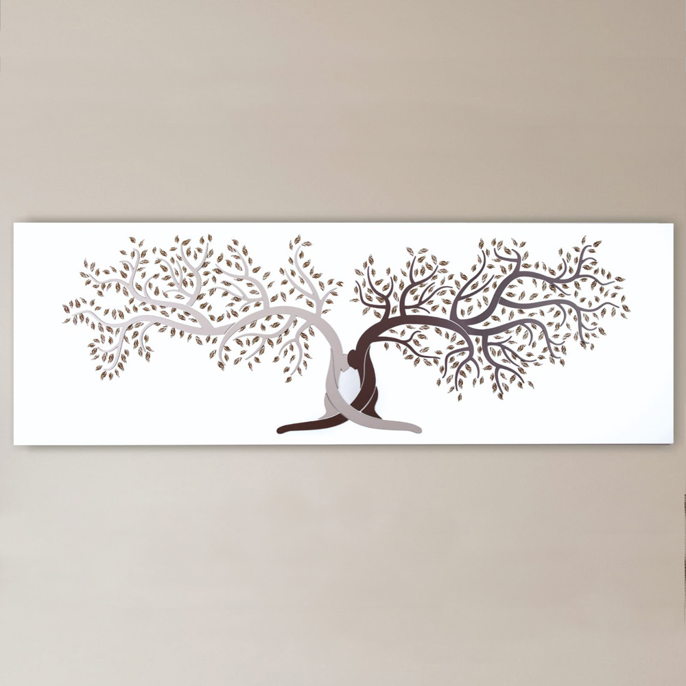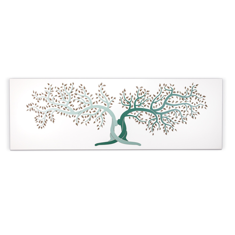 Panou decorativ reprezentand unirea a doua trunchi cu o imbratisare, simbol al vietii. Ramurile și frunzele realizate cu marcaj cu laser se ramifică din trunchi. Panou din lemn lacuit alb mat cu aplicatii din lemn lacuit in doua nuante de pietris si cacao sau in varianta sa verde si marcare laser.