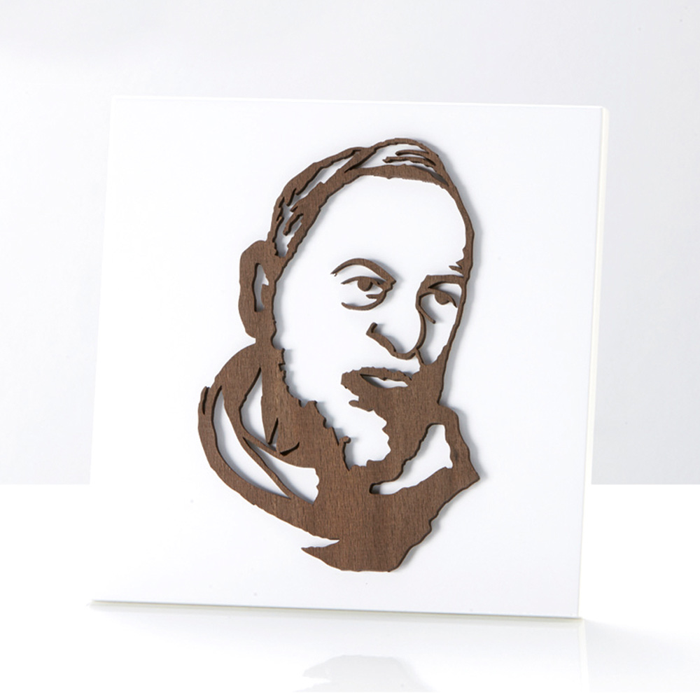 Tablou sfânt cu Padre Pio din lemn wengé aplicat. Panou din lemn lacuit alb cu picior de sustinere si orificiu pentru a-l agata pe perete.