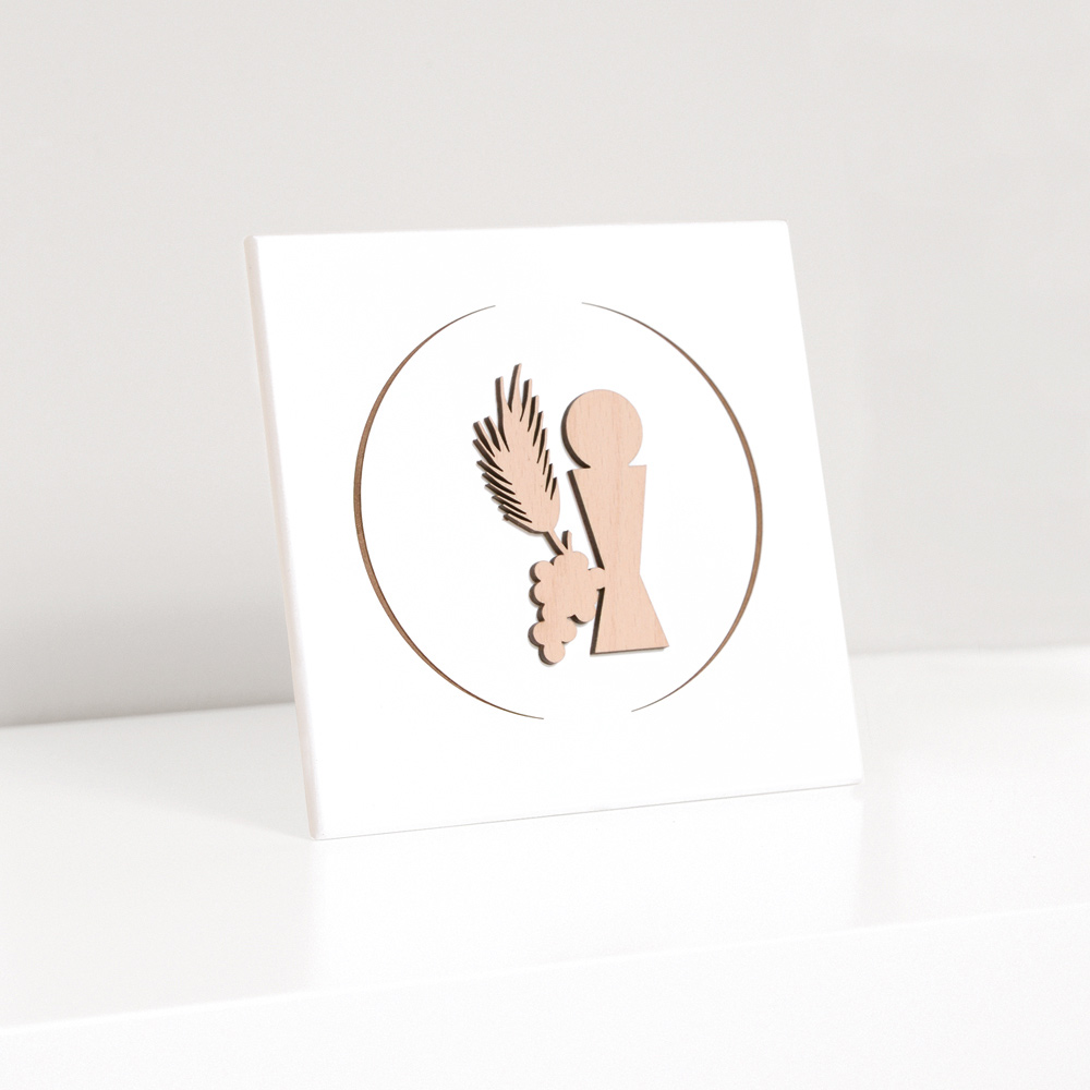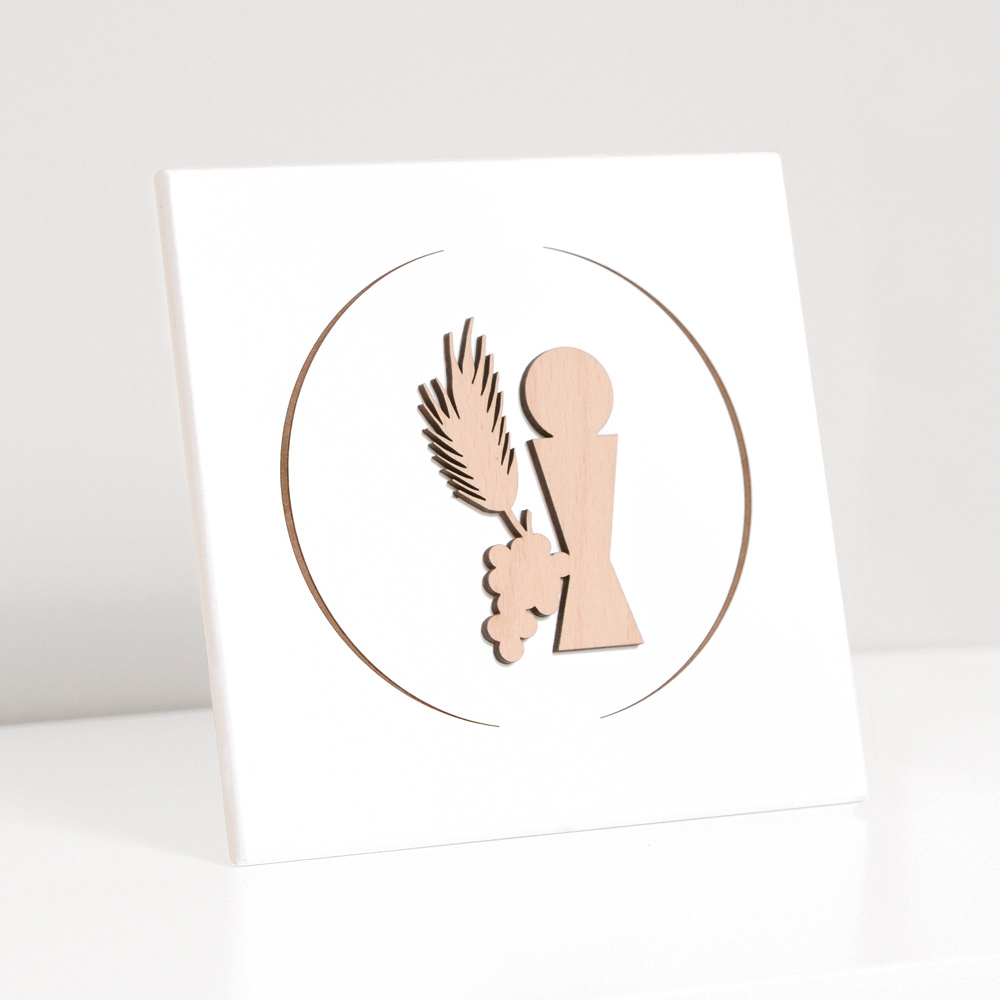 Tablou sacru cu potir, spic si struguri din lemn natural aplicat si gravat cu laser. Panou din lemn lacuit alb cu picior de sustinere si orificiu pentru a-l agata pe perete.