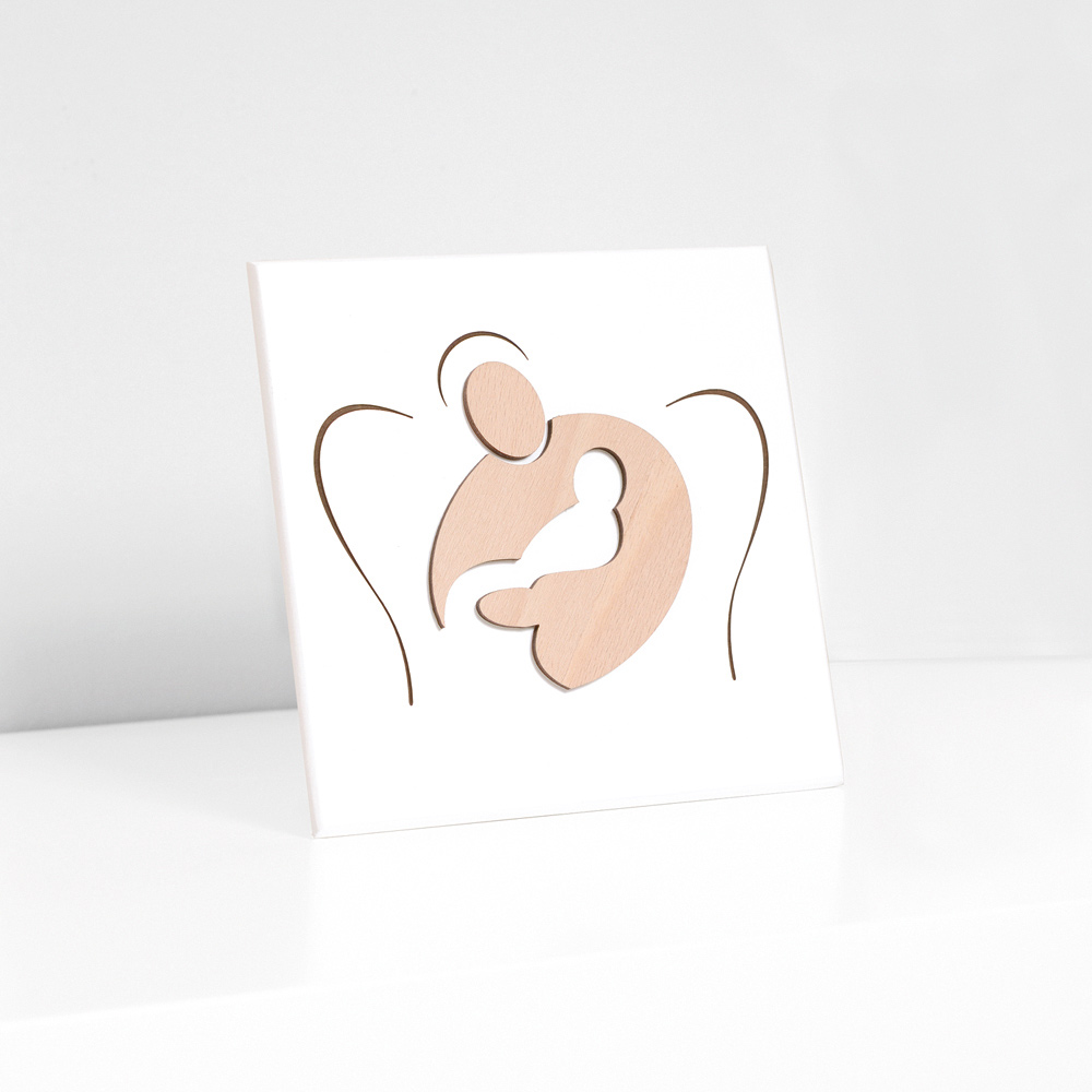 Poza sfântă cu aplicare în lemn natural a unei mame îmbrățișând un copil și gravare cu laser. Panou din lemn lacuit alb cu picior de sustinere si orificiu pentru a-l agata pe perete.