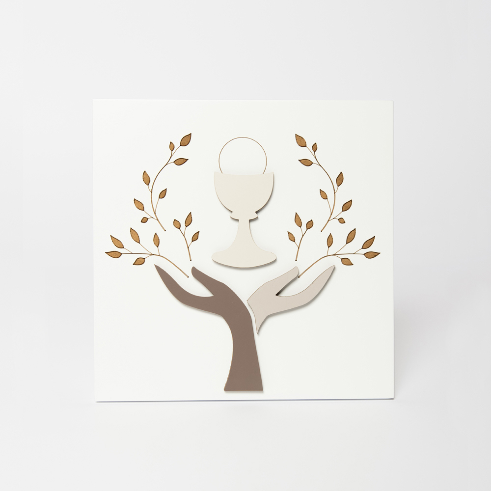 Tablou sacru cu decoratiuni aplicate din lemn lacuit cacao, pietris si nisip si marcare cu laser a ramurilor si frunzelor. Reprezintă două mâini care întâmpină potirul comuniunii. Tabloul este din lemn lacuit alb, cu un orificiu pentru agățat pe perete și un picior pentru sprijin.