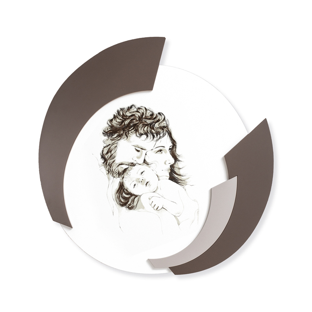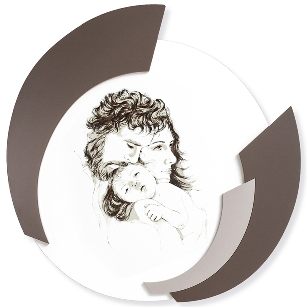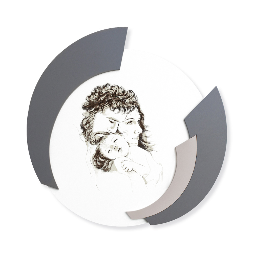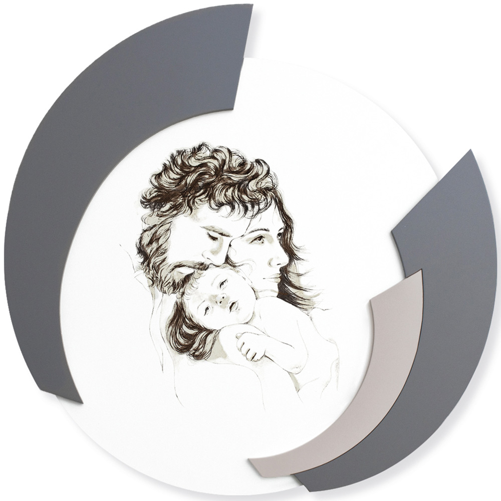 O tablie rotunda ce inglobeaza imaginea Sfintei Familii inconjurata de decoratiuni din lemn lacuit in culorile la alegere . Panou din lemn lacuit alb mat cu marcare cu laser, o tehnica speciala care creeaza un basorelief pe materiale. Designul original realizat manual combinat cu tehnologia laser da viata acestei lucrari gravate pe mai multe niveluri.
