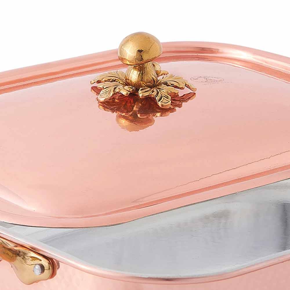 Prăjitor dreptunghiular din cupru cu capac și mânere din alamă, fabricat în Italia.