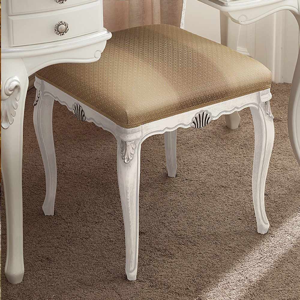 Puf în stil clasic din lemn, căptușit și îmbrăcat în material textil , disponibil în finisaje din lemn de nuc Bassano cu detalii aurii antic sau detalii din lemn alb și argintiu.