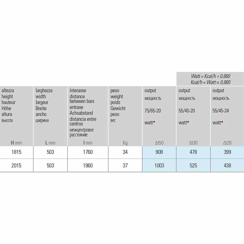 - H 2015 x L 503 x Inter. 1960 mm x Randament w (Δt50 *) 1003; Randament w (Δt30 *) 525; Randament w (Δt26 *) 438