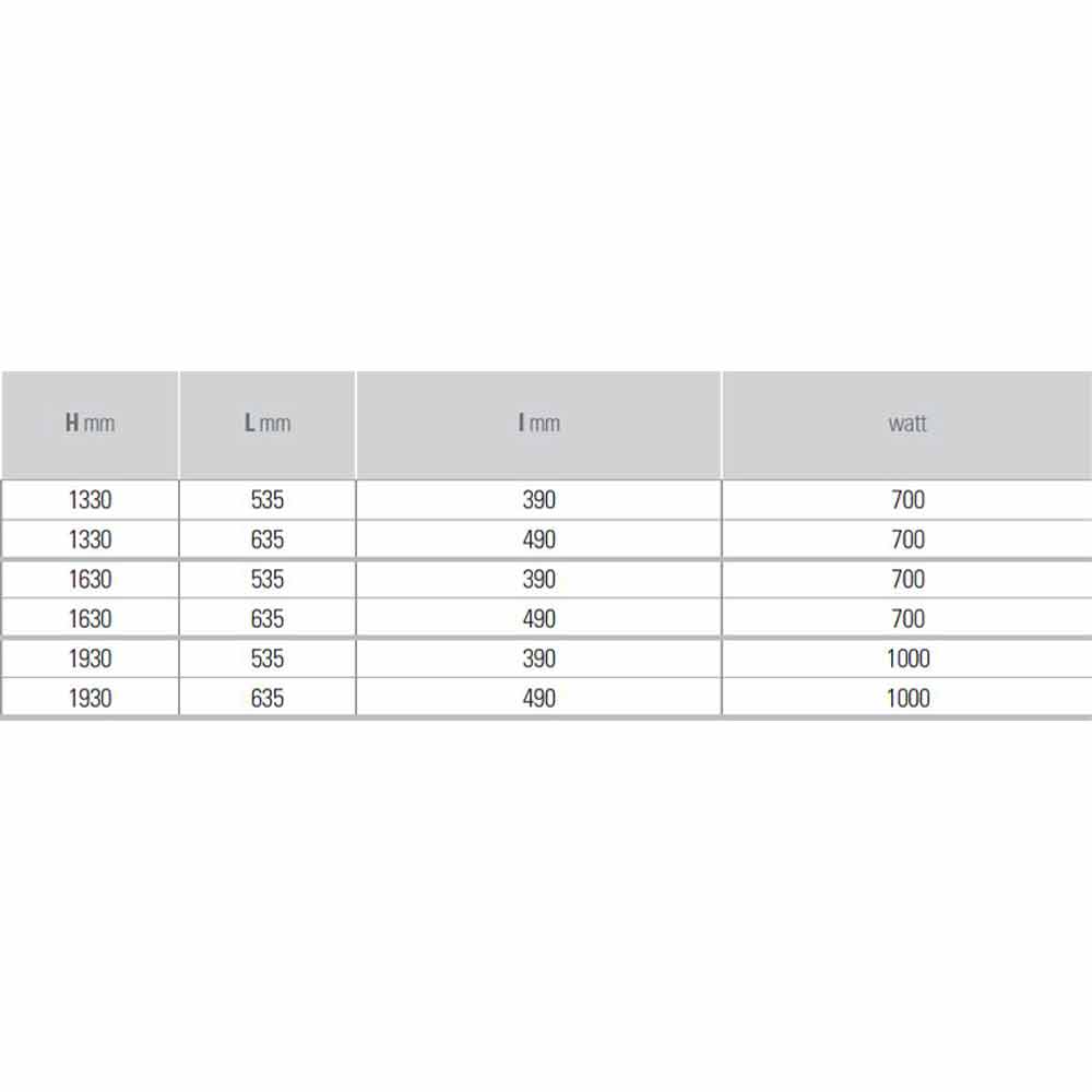 - H 1820 x L 535 x Inter. 460 x P 63 mm x Randament w 1000;