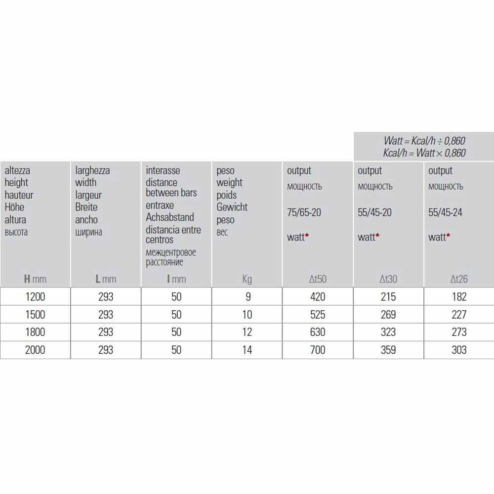 - H 1800 x L 293 x Inter. 50 mm x Randament w (Δt50 *) 630; Randament w (Δt30 *) 323; Randament w (Δ26 *) 273;