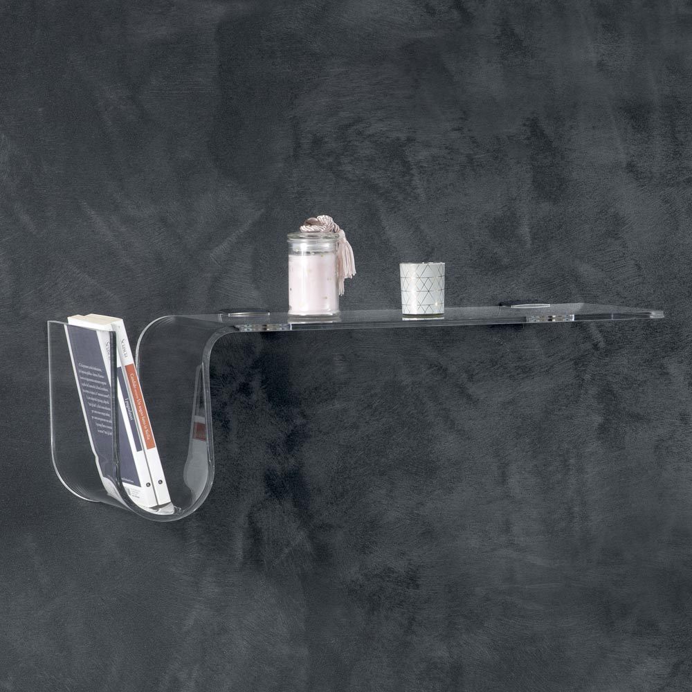 Acest raft de perete este realizat integral din cristal acrilic transparent de 8 mm grosime , disponibil in varianta dreapta sau stanga.