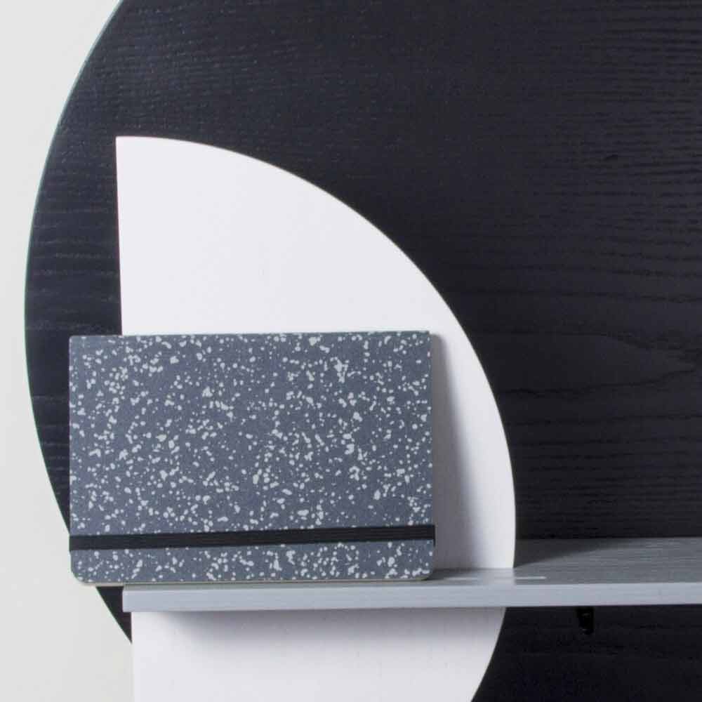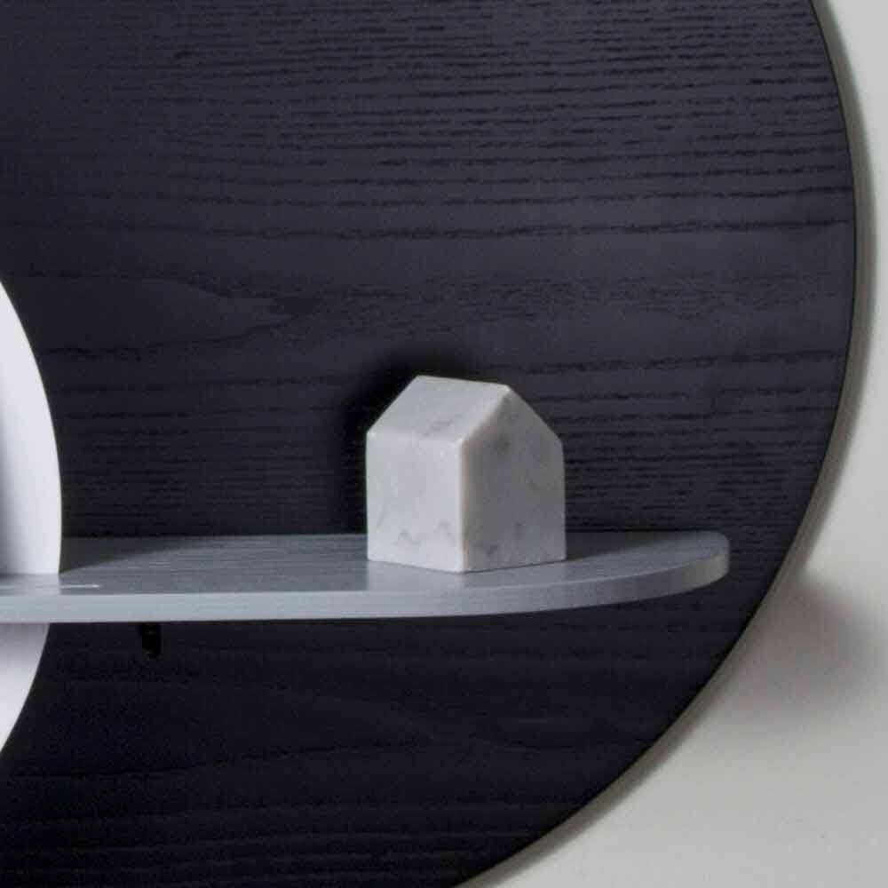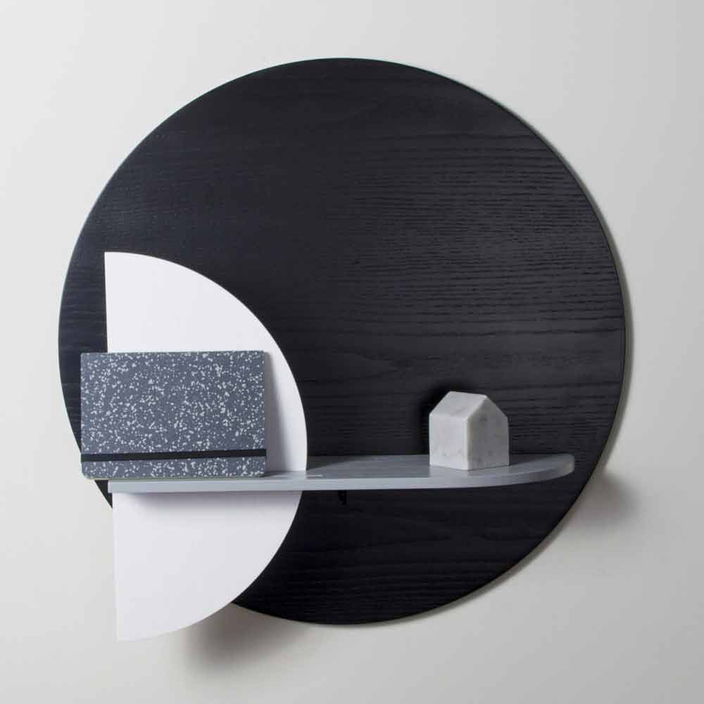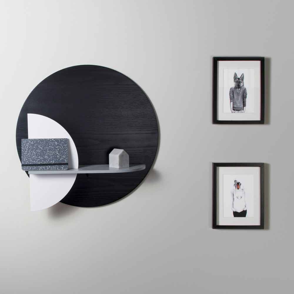 Structura sa este compusă din 3 panouri de diferite forme realizate din placaj de frasin colorat alb, negru și gri, dintre care unul este montat pe perete care reprezintă suprafața reală de susținere și două panouri verticale care conferă mișcare și armonie. Particularitatea acestui raft este posibilitatea de a personaliza produsul prin combinarea celor 2 panouri verticale care vă permit să alegeți între 8 configurații diferite în funcție de gusturi și nevoi.