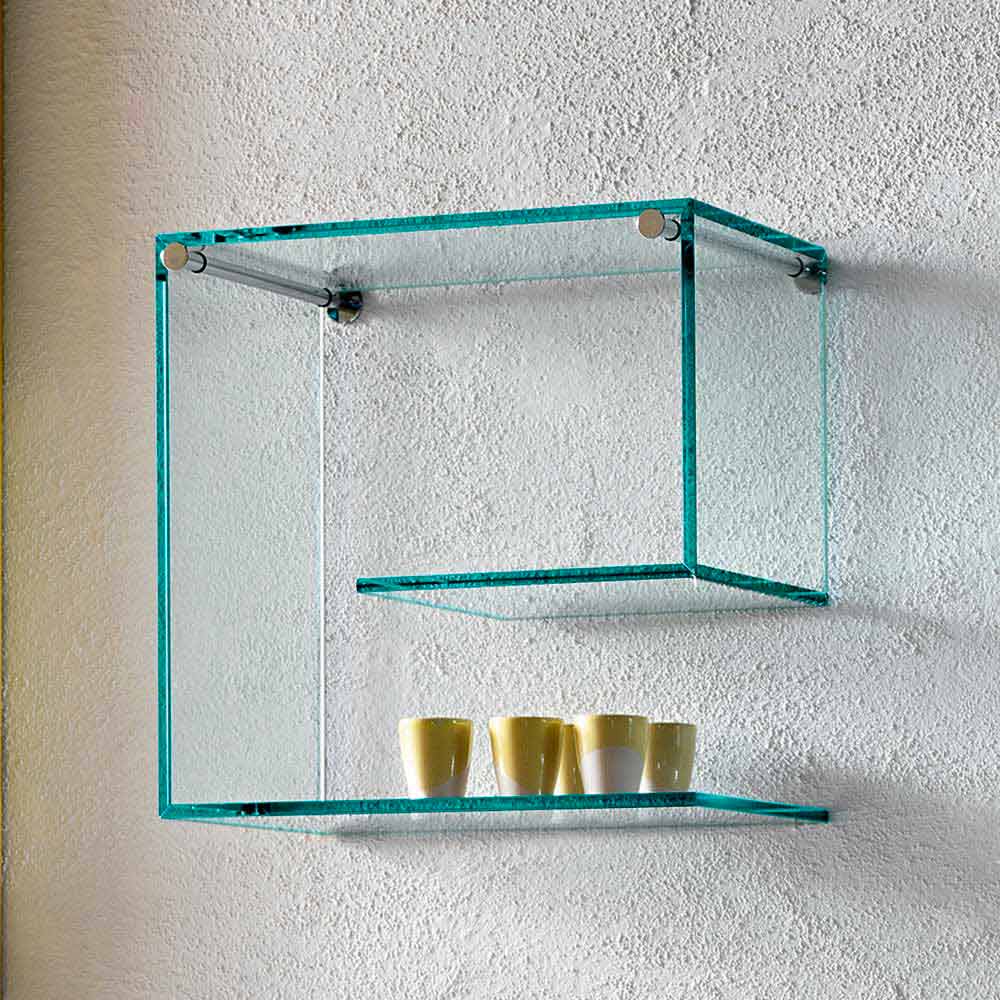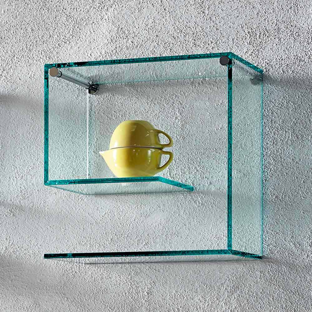 Această pereche de rafturi de perete se caracterizează prin designul său versatil și geometric realizat în întregime din sticlă float cu grosimea de 10 mm în finisaj transparent.