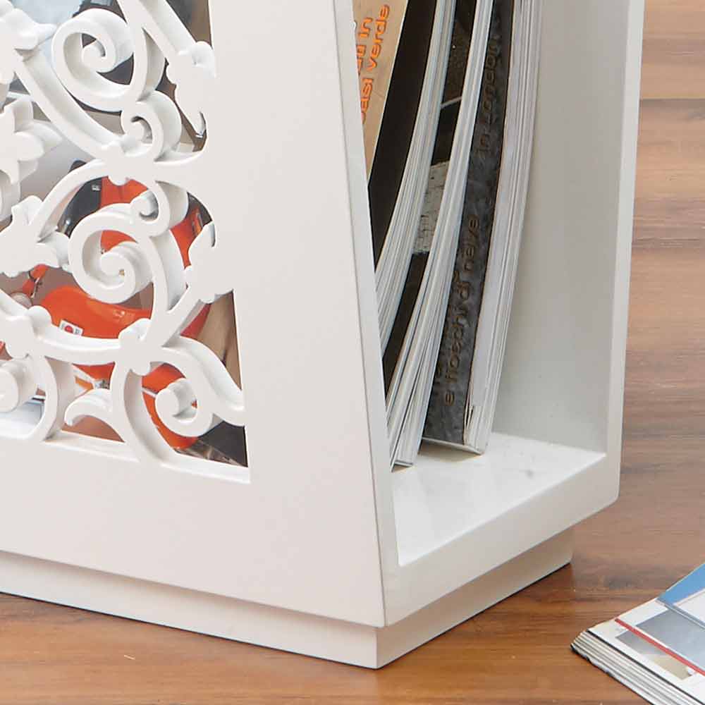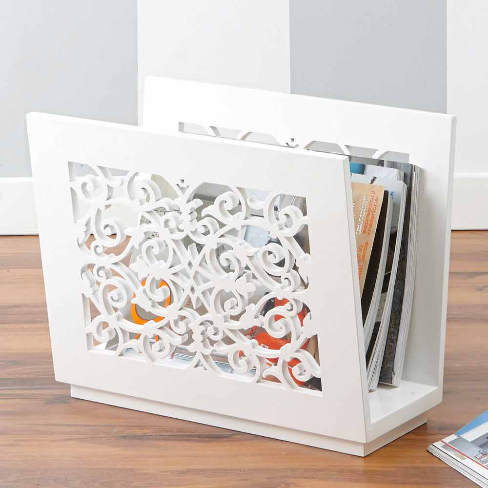 Suport pentru reviste de podea din lemn în formă, a cărui textură amintește de un