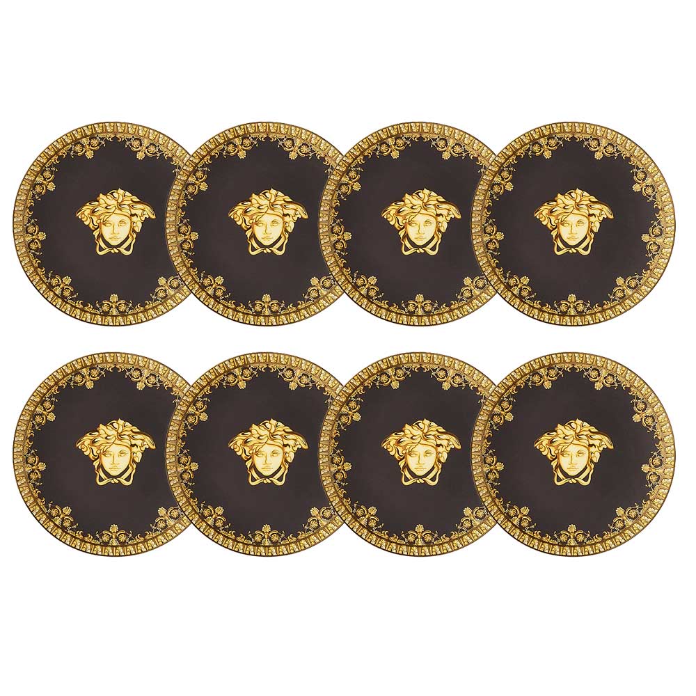 Farfuria I Love Baroque de la Versace , realizata din portelan fin , este esenta rafinamentului si a luxului atemporal . Designul sofisticat prezintă un fundal negru profund, îmbogățit de un chenar decorat cu motive baroc aurii care întruchipează tradiția artistică a casei. În centru, chipul iconic al Medusei , simbol al puterii și farmecului etern, domină, dând un caracter regal și distinctiv acestei capodopere.
