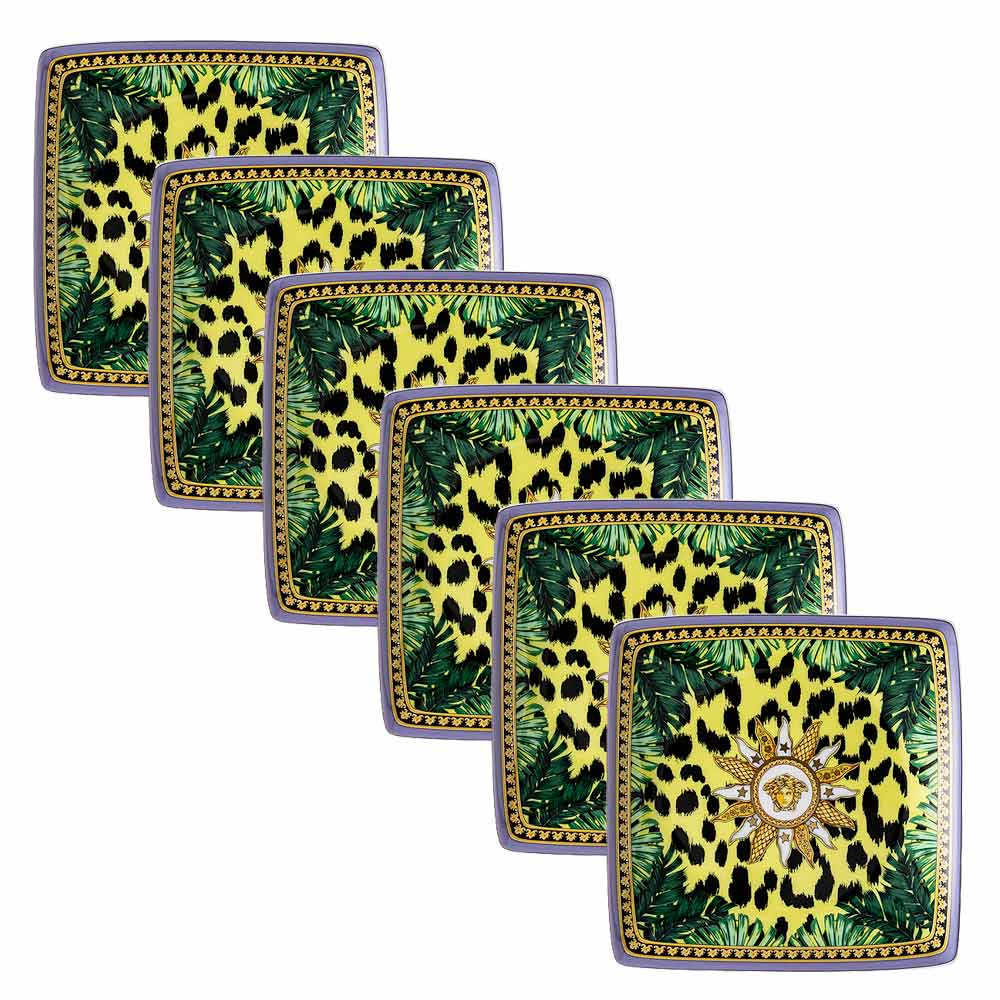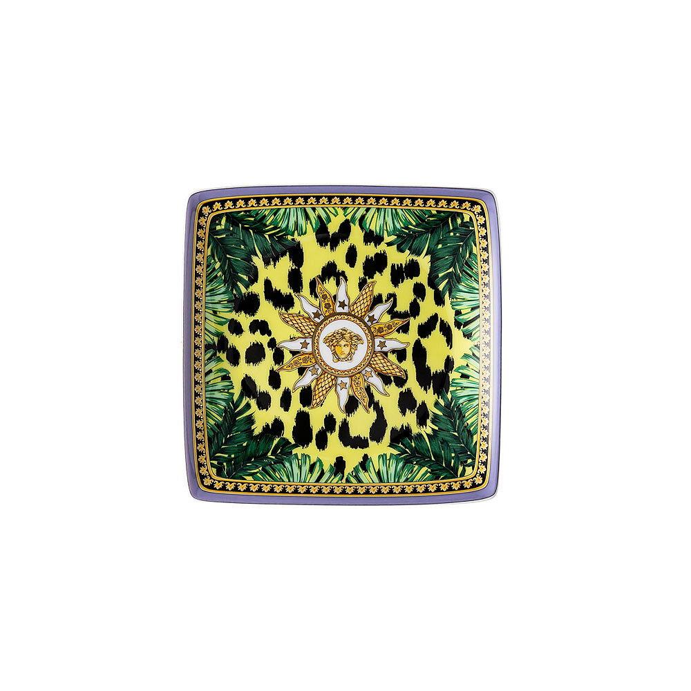 Cana Jungle Animalier de la Versace , realizată din porțelan fin , este o explozie de stil și lux sălbatic . Designul său atrăgător combină un motiv animalier vibrant pe un fundal galben, încadrat de frunze tropicale luxuriante și dominat de simbolul emblematic Medusa , așezat într-un soare auriu și împodobit cu detalii baroc.