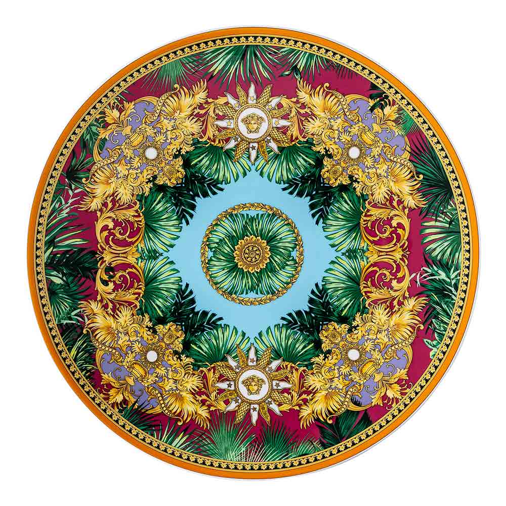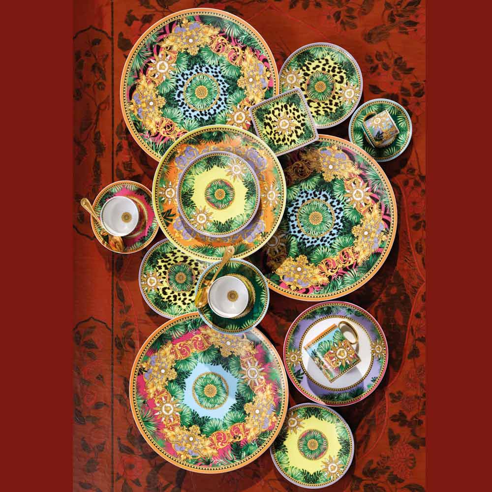 Serviciul Jungle Animalier de la Versace , din portelan fin , este o sarbatoare a exotismului si luxului . Designul extraordinar combină un amestec de motive tropicale , cu frunze luxuriante, elemente baroc aurii și simbolul inconfundabil al Medusei , așezat într-un soare strălucitor. Culorile strălucitoare, variind de la verde intens la turcoaz, trecând prin detalii de roșu rubin și accente aurii, creează o operă de artă vibrantă și captivantă.