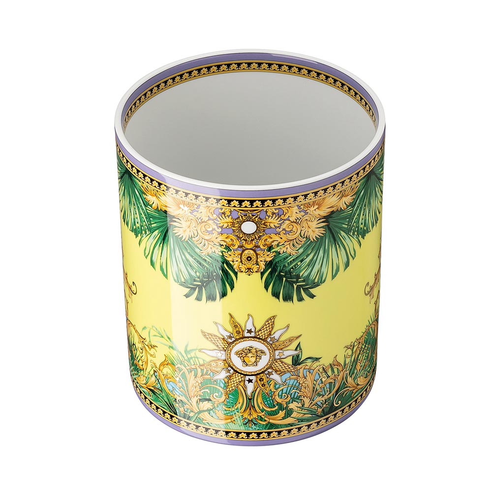 Vaza Jungle Animalier de la Versace , realizată din porțelan fin , este o capodopera care combină eleganța exotică și luxul atemporal. Designul uimitor prezintă un galben vibrant, împodobit cu motive tropicale de frunziș luxuriant și detalii baroc complexe, toate încadrate de legendarul simbol Medusa în centru, așezate într-un soare strălucitor și decorate cu detalii aurii.