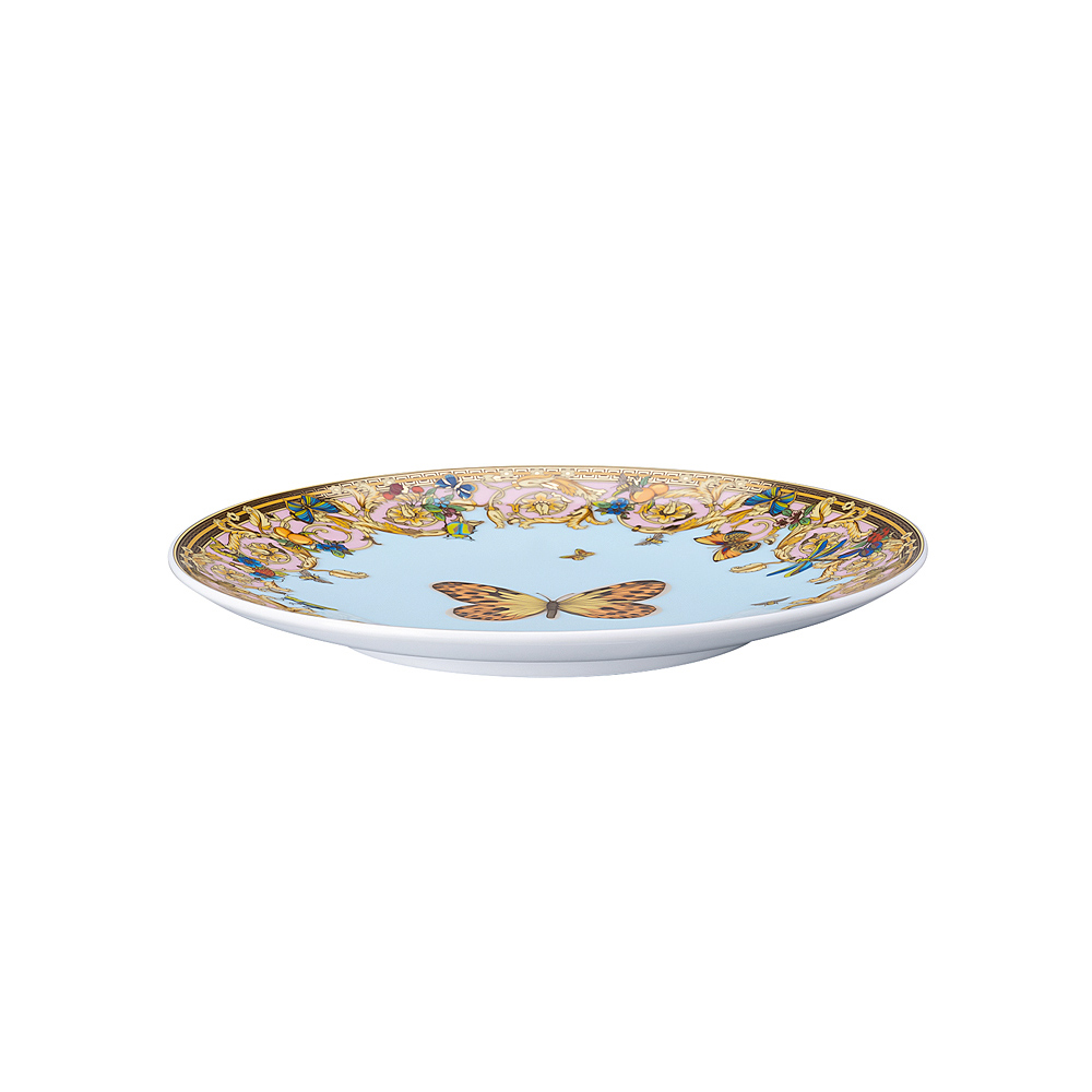 Această farfurie fermecătoare din porțelan are un design luminos și colorat, care atrage imediat atenția, făcându-l o piesă de colecție, precum și o veselă rafinată. Un fluture elegant iese in evidenta in centru, inconjurat de un chenar ornamental delicat cu motive florale si arabescuri, pe un fundal albastru senin.