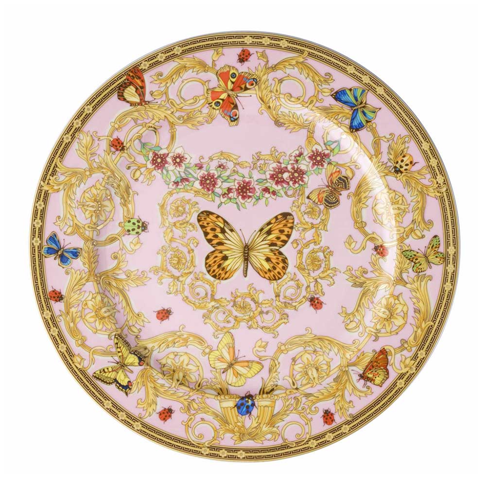 Această farfurie magnifică din porțelan celebrează frumusețea naturii cu designul său bogat de fluturi colorați și motive florale complicate, așezate pe un fundal roz încântător. Fiecare detaliu este lucrat cu meticulozitate, de la fluturii vibranti care par să-și ia zborul din farfurie, până la florile delicate și ornamentele aurii care încadrează și înfrumusețează designul.