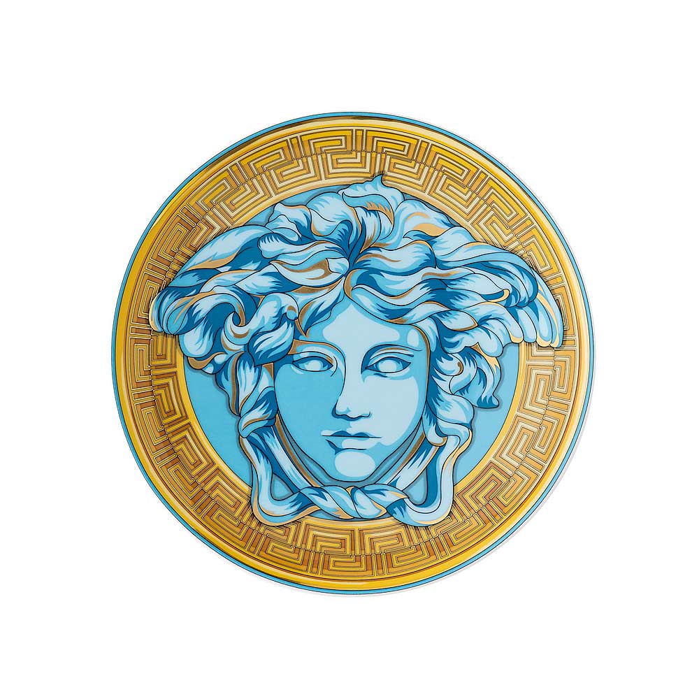 Farfuriile de pâine amplificate Versace Medusa , realizate din porțelan prețios , întruchipează un echilibru perfect între artă și luxul contemporan . Designul îndrăzneț evidențiază chipul legendar al Medusei , simbolul iconic al casei, înconjurat de un motiv grecesc auriu vibrant și nuanțe delicate care conferă o notă modernă și rafinată.