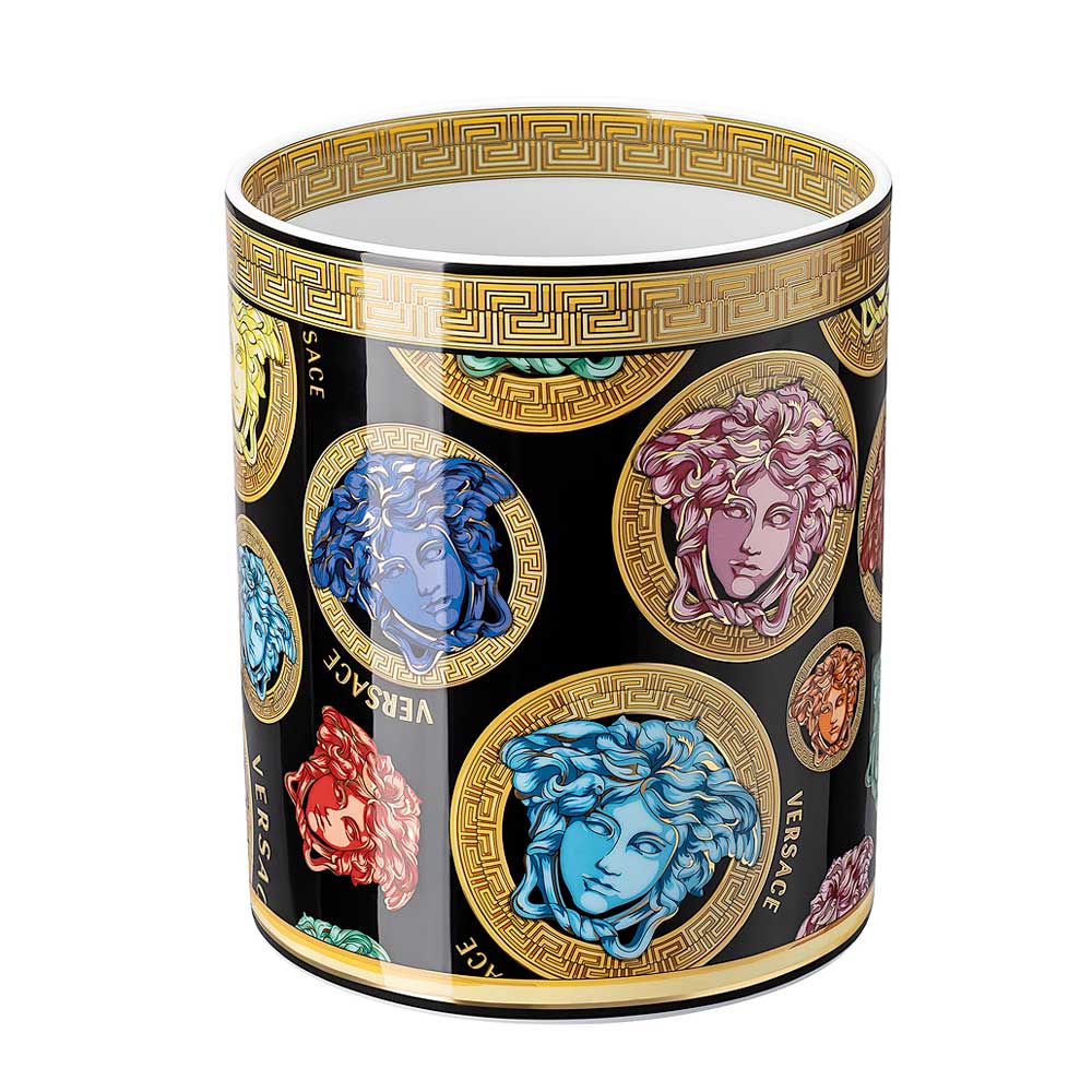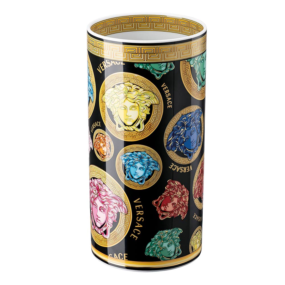Vaza Medusa Amplified Multicolor de la Versace , realizata din portelan rafinat , este o adevarata bijuterie de design. Motivul său captivant evidențiază emblematica Medusa , reinterpretată într-o varietate vibrantă de culori care ies în evidență elegant pe fundalul negru lucios . Rama superioară decorată cu motivul clasic grecesc auriu adaugă o notă de rafinament și opulență, făcând din această vază o adevărată operă de artă.