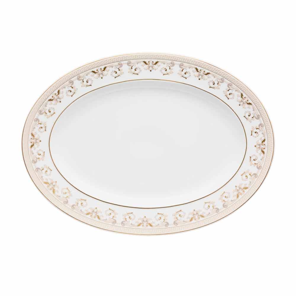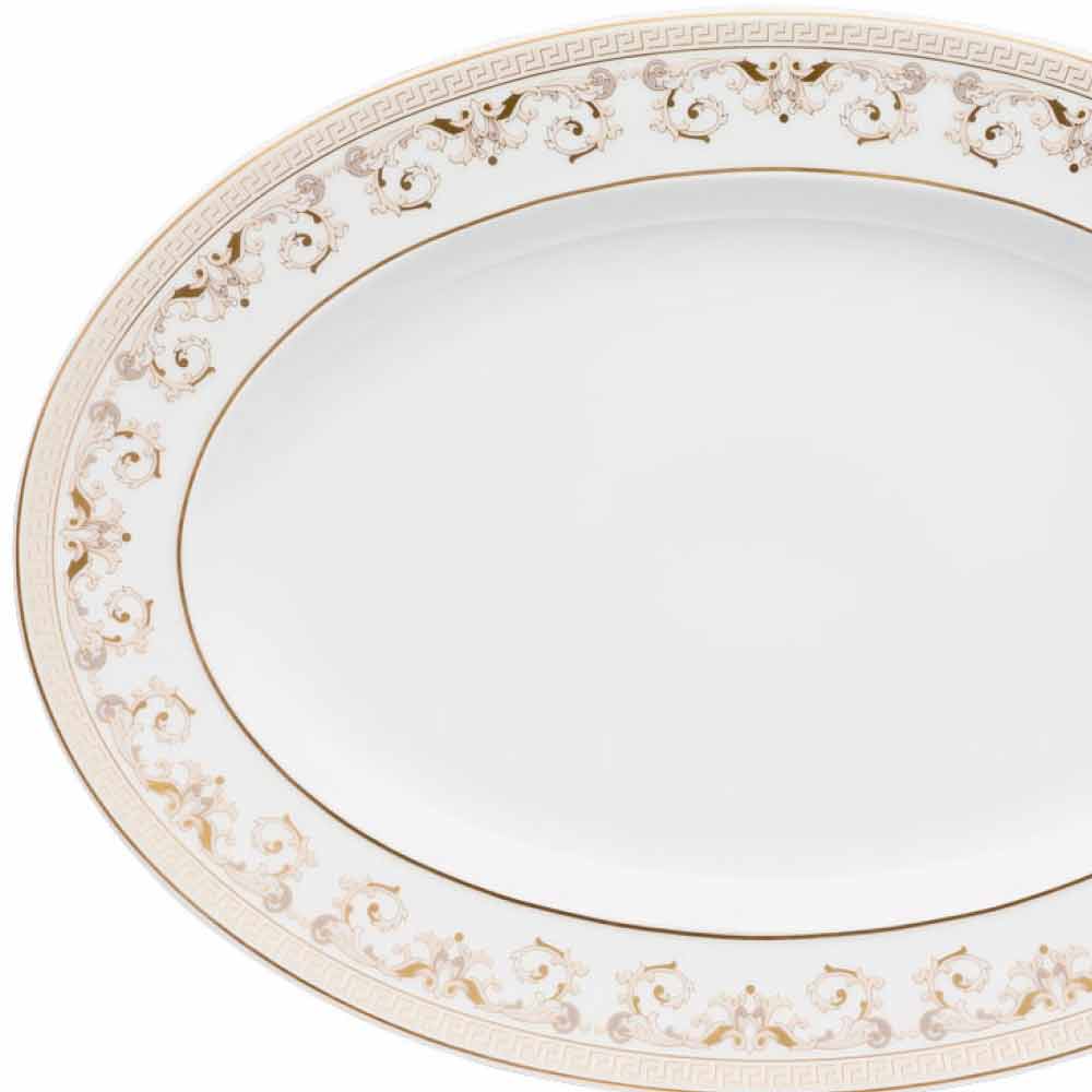 Farfuria ovală de 34x24,5 cm de la Versace face parte din colecția de mese rafinată și luxoasă Medusa Gala.