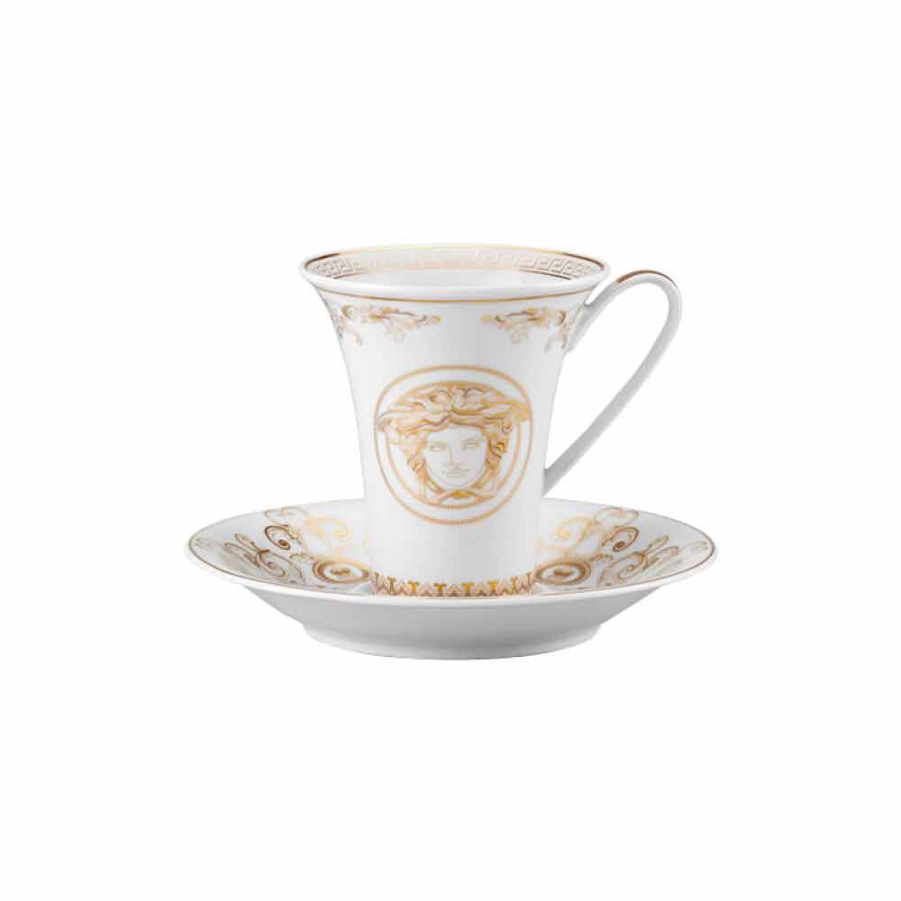 Ceașca de cafea înaltă și fantastică, cu farfurie, de la Versace, face parte din colecția de mese rafinată și luxoasă Medusa Gala.