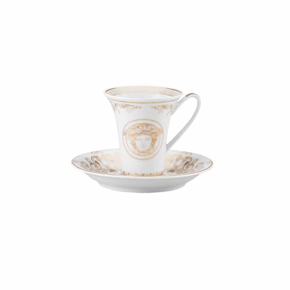 Cana de cafea și farfuria rafinată și de designer de la Versace face parte din colecția de mese rafinată și luxoasă Medusa Gala.