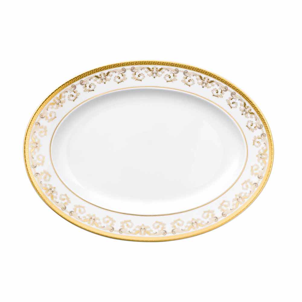 Farfuria ovală de 34x24,5 cm de la Versace face parte din colecția de mese rafinată și luxoasă Medusa Gala Gold.