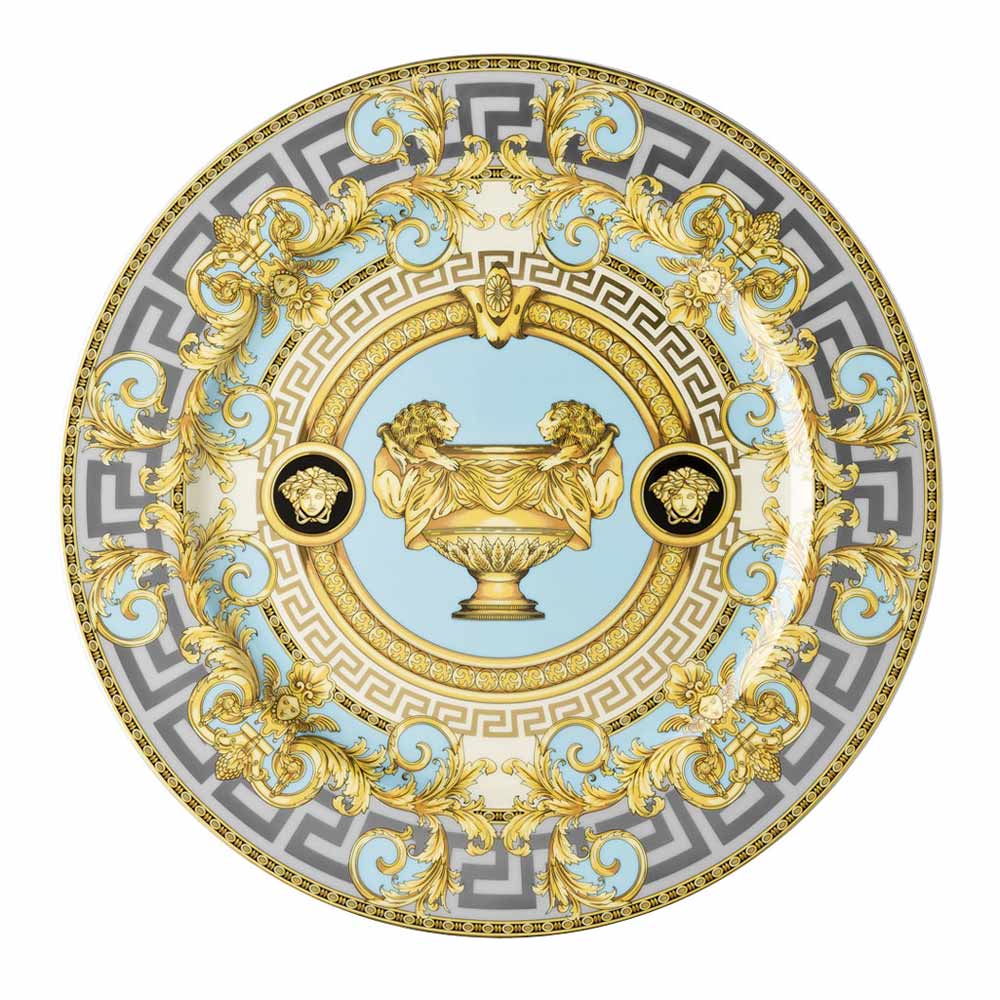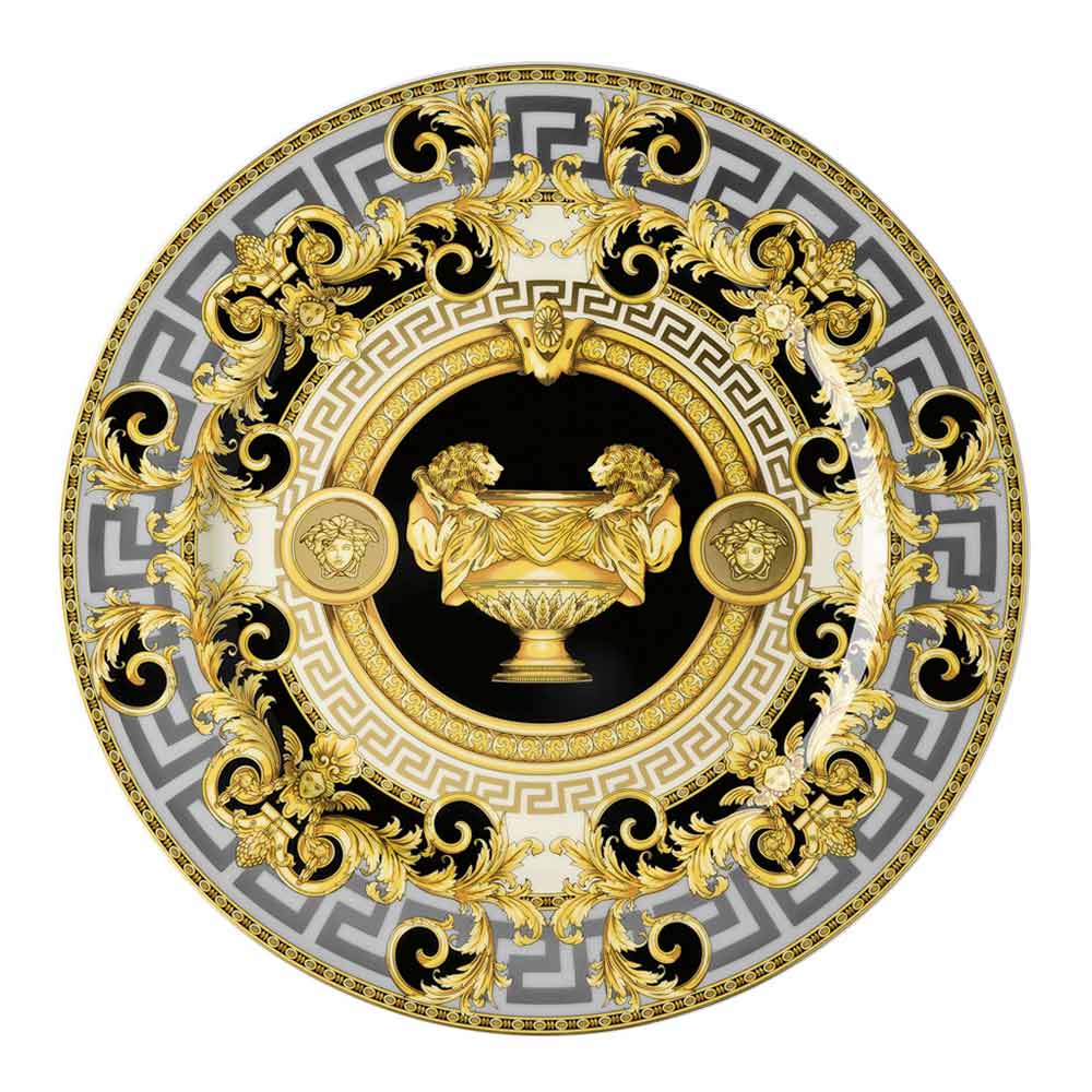 Farfuria Prestige Gala de la Versace , realizată din porțelan rafinat , este un tribut autentic adus eleganței clasice și luxului atemporal. Designul extraordinar este dominat de o splendidă amforă aurie , simbol al regalității și măreției, în centrul unui cadru împodobit cu motivul clasic grecesc și detalii florale baroc în aur. Disponibilă în două variante de fundal, negru și albastru deschis, această farfurie oferă un contrast sofisticat care ridică fiecare mise en place.