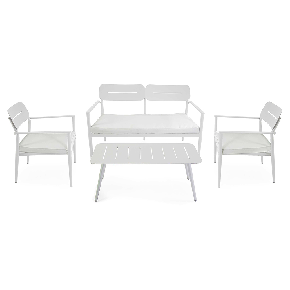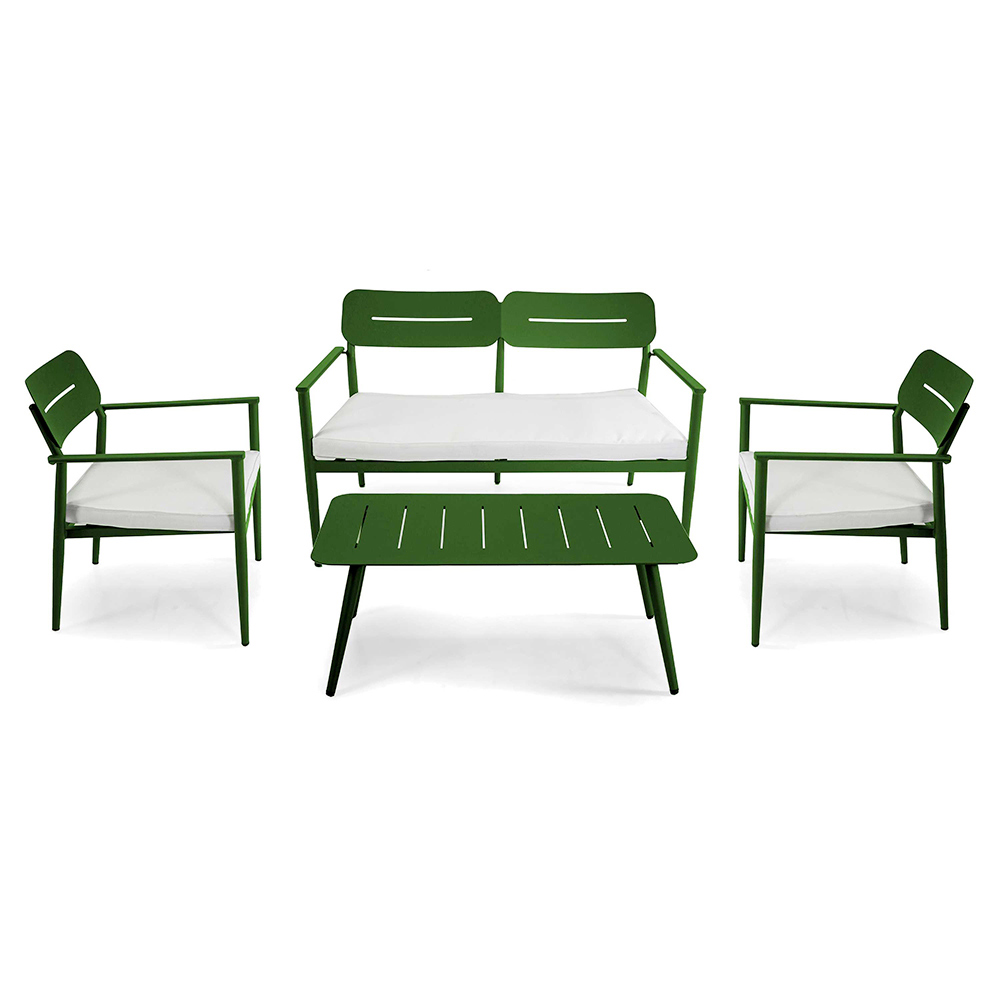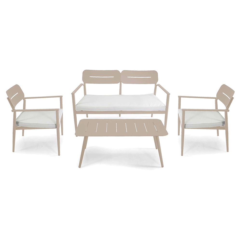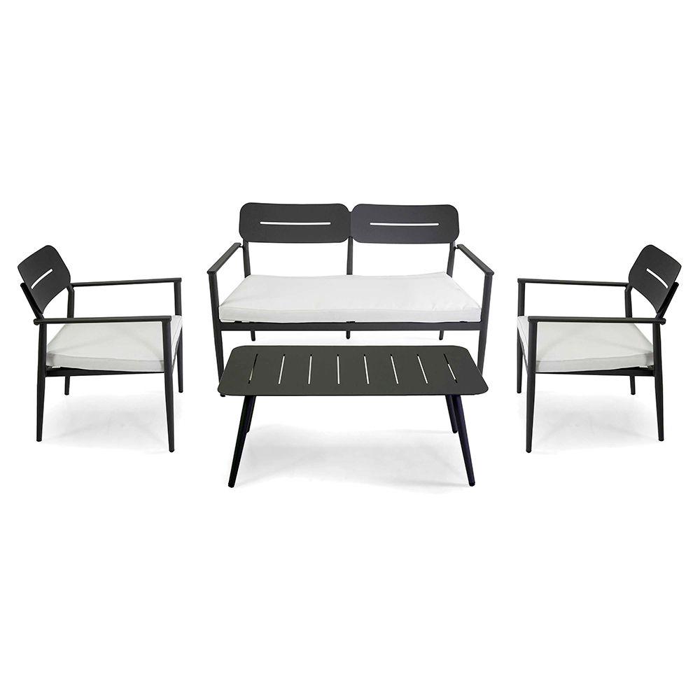 Acest salon de exterior combină funcționalitatea și stilul modern , perfect pentru cei care doresc să amenajeze spațiile exterioare cu gust. Cadrul din aluminiu este atât elegant, cât și robust, asigurând o durată lungă de viață și o întreținere ușoară. Fiecare element al setului este conceput pentru a oferi un confort maxim, de la fotoliu cu spătar ergonomic, până la sofa spațioasă, cu perne moi și primitoare.