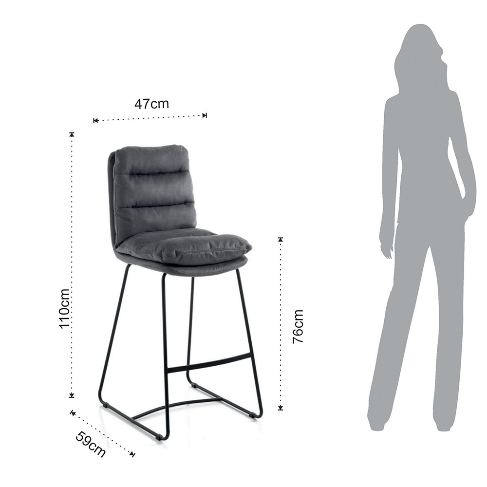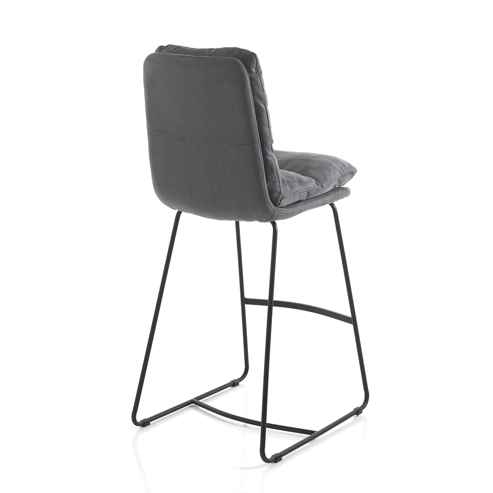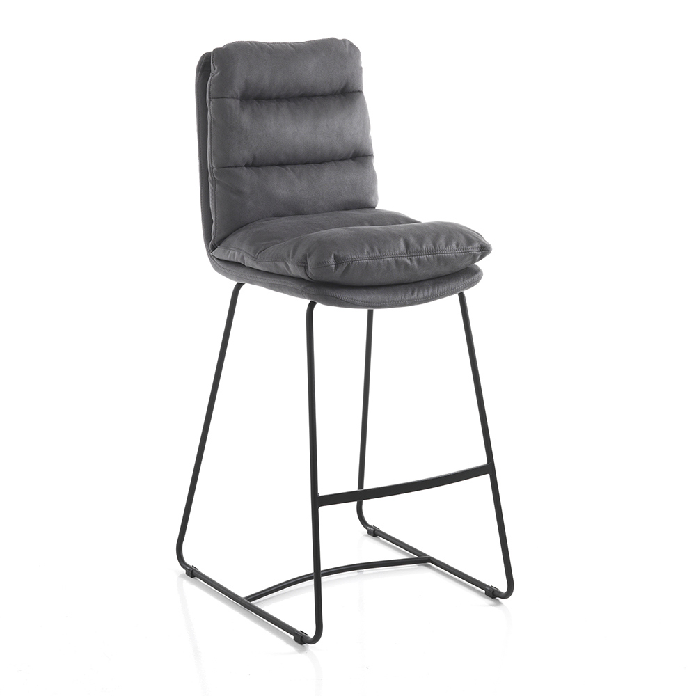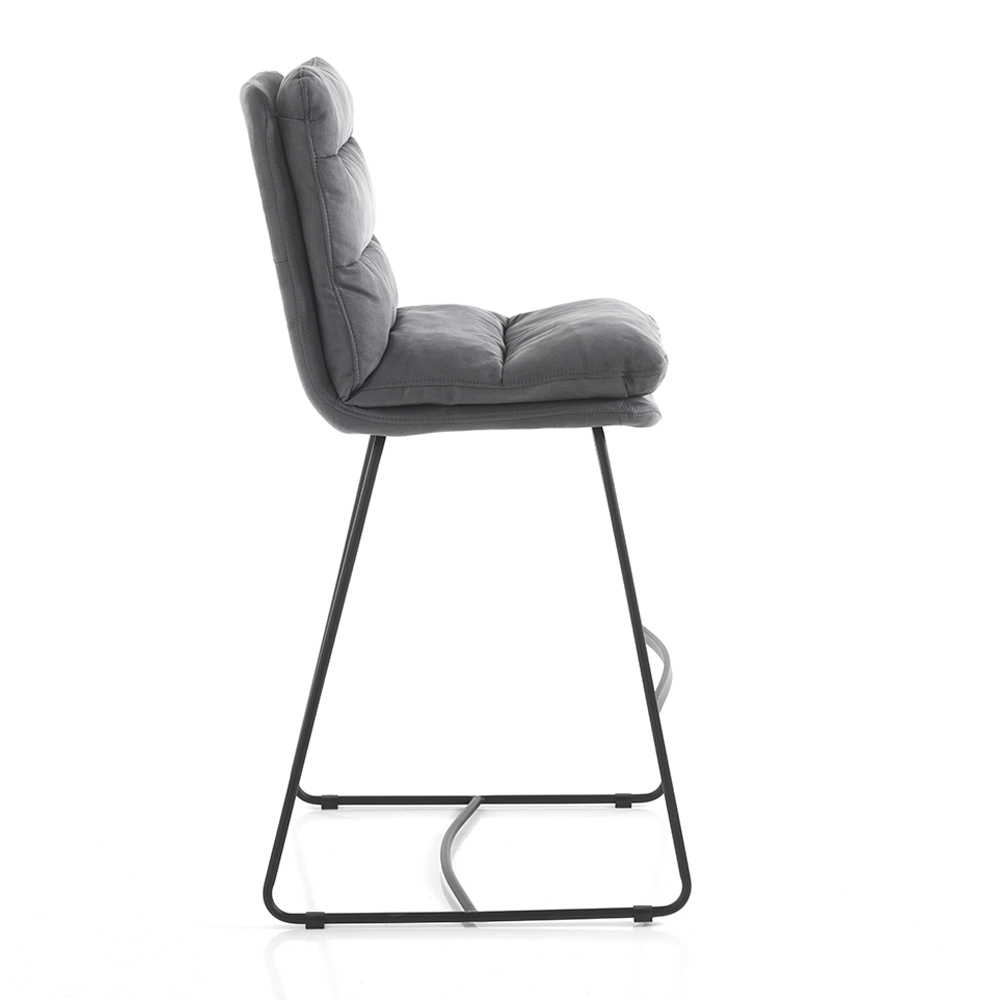 Scaun inalt de bucatarie cu structura sanie din otel vopsit negru mat complet cu suport practic pentru picioare si sezut captusit imbracat in microfibra moale cu efect de catifea gri . Un produs a cărui estetică este marcată de linii și forme simple îmbogățite de matlasarea elegantă care acoperă întregul scaun, dând și mai mult o minunată senzație de confort. Ideal pentru a fi amplasat in sala de mese si bucatarie dar si in spatii contract precum baruri si restaurante datorita designului elegant si rafinat si versatilitatii sale de utilizare.