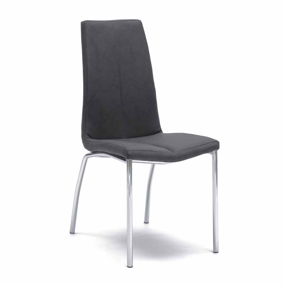 Scaun cu bază din metal cromat. Scaun și spate tapițate din imitație de piele căptușită. Disponibil în diferite culori: selectați finisajul dorit din meniul derulant.