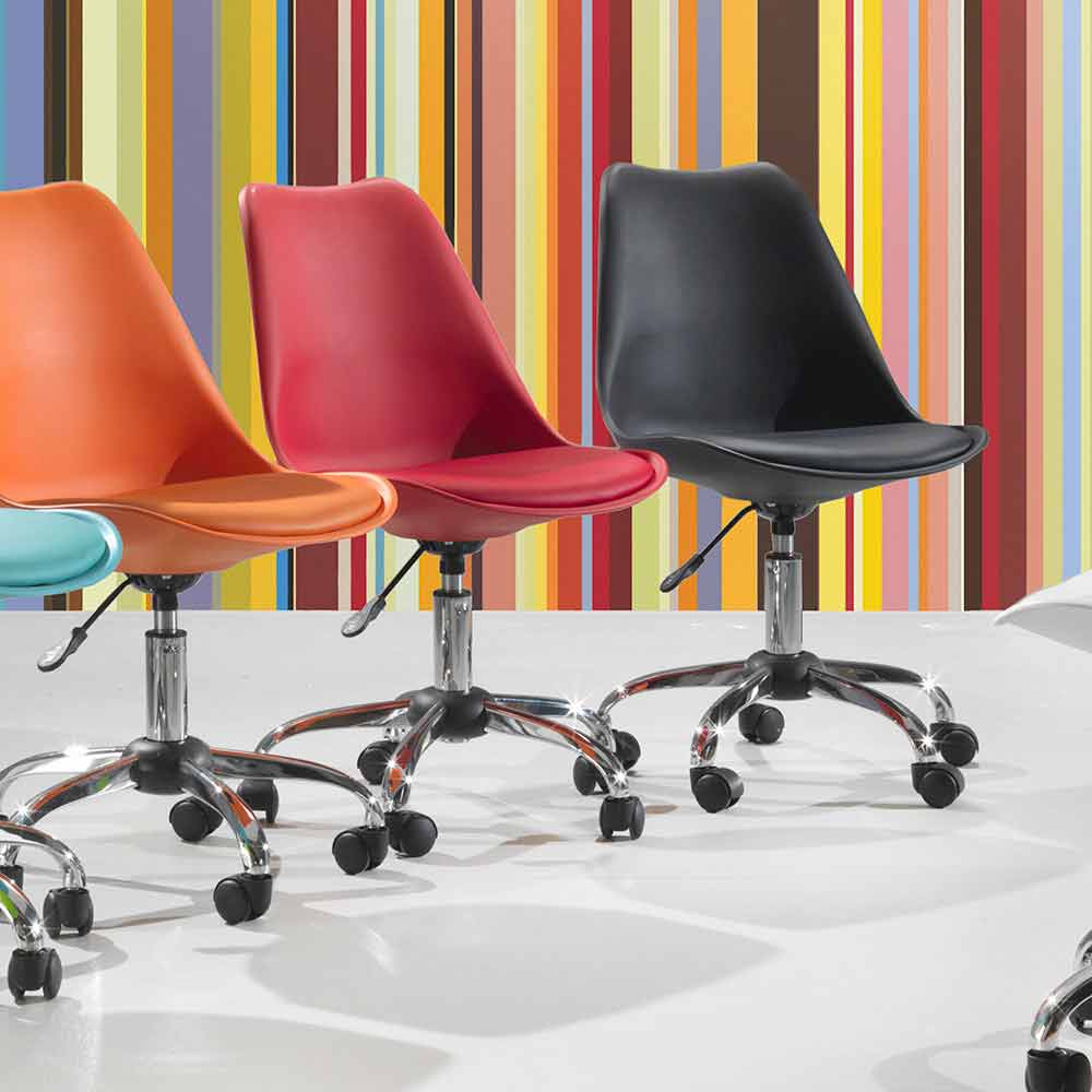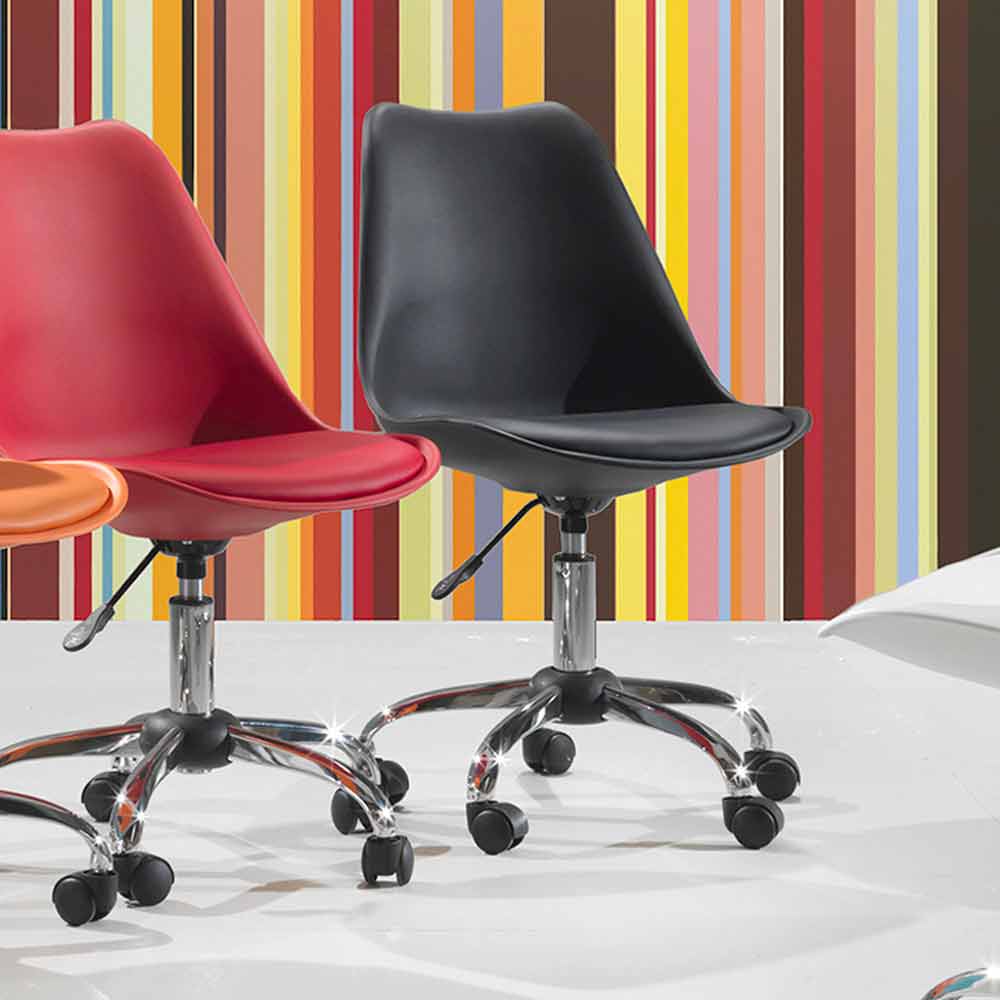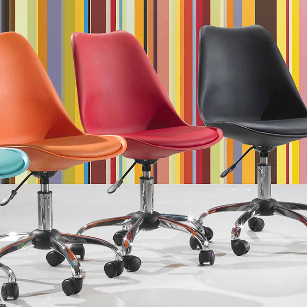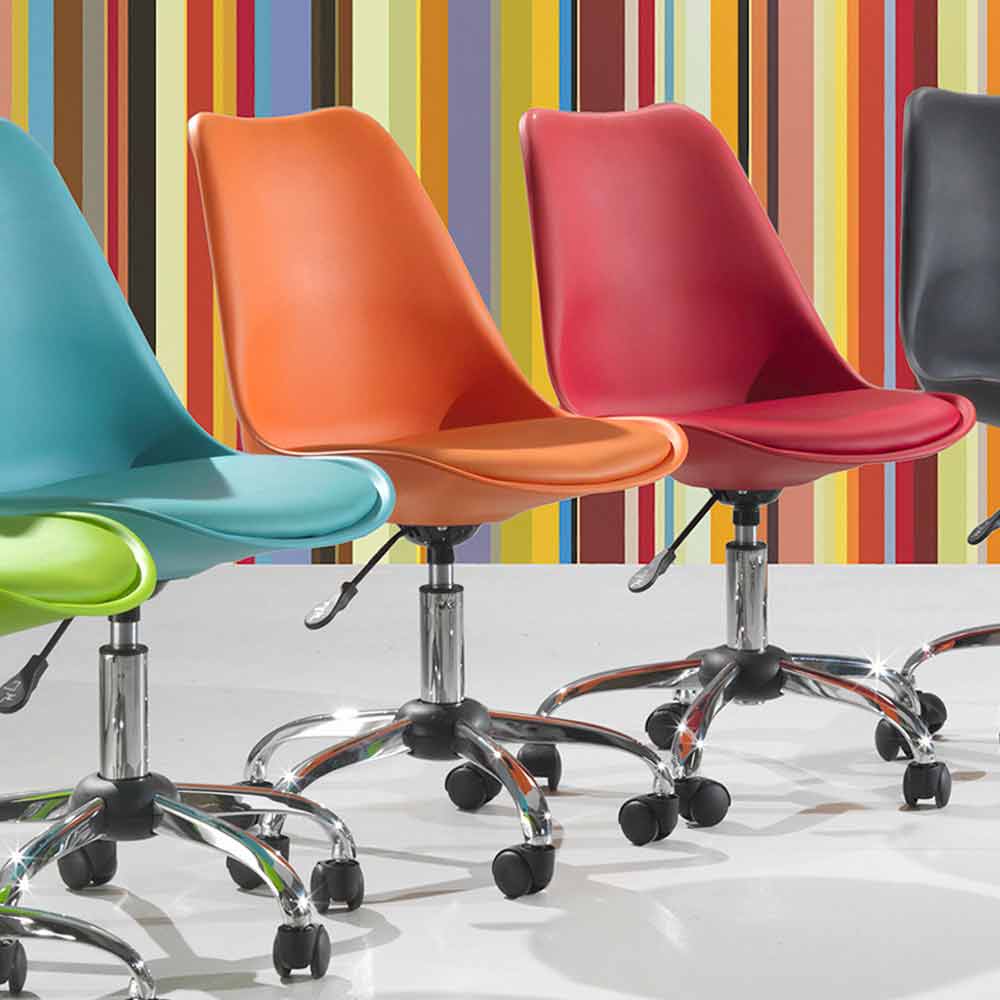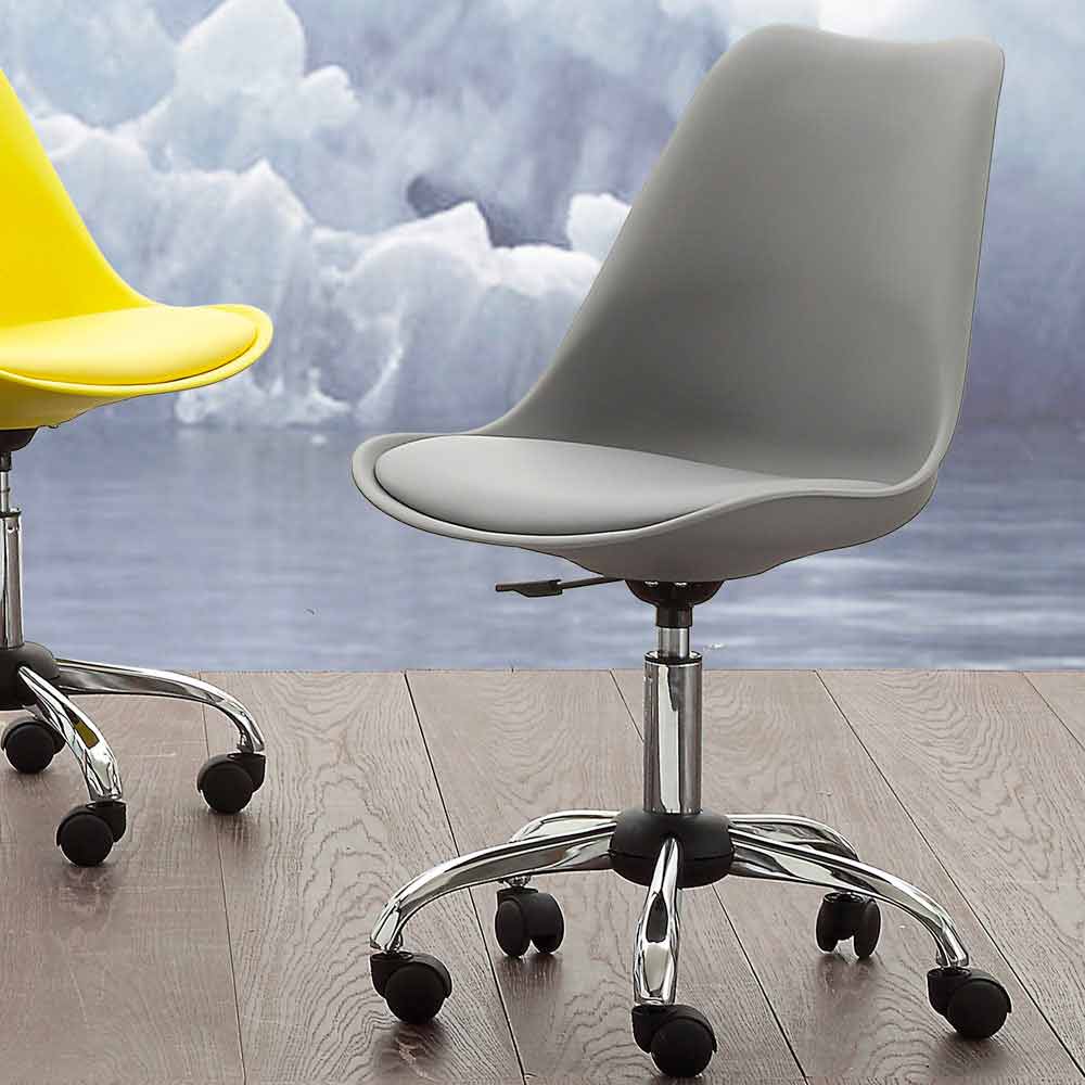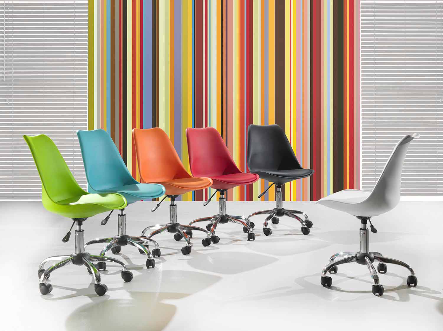 Scaun de birou din polipropilenă colorată și bază metalică cromată cu lift pe gaz.