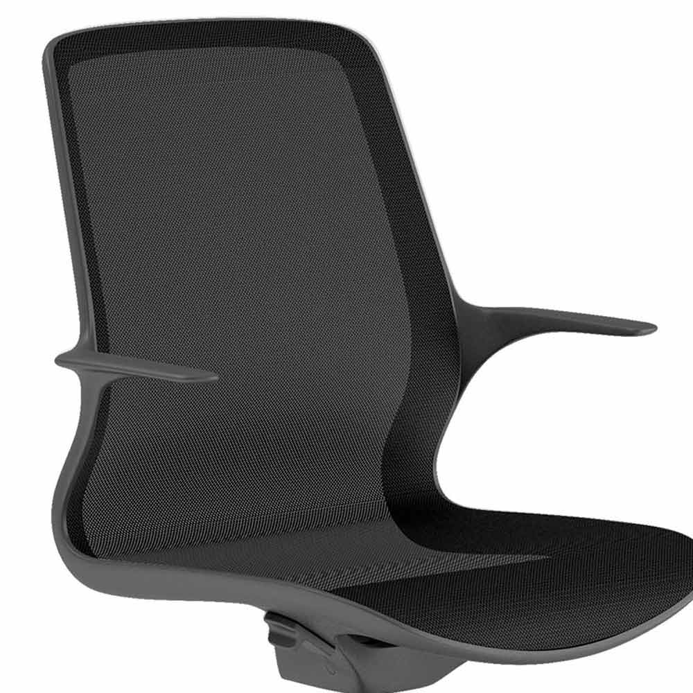 Scaun rotativ de birou cu cotiere fixe acoperite cu plasă neagră, structură din nylon negru.