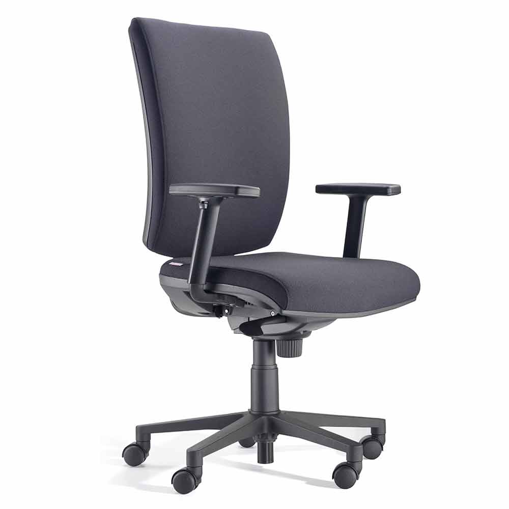 Scaun de birou ergonomic cu cotiere reglabile, din țesătură și nailon negru.