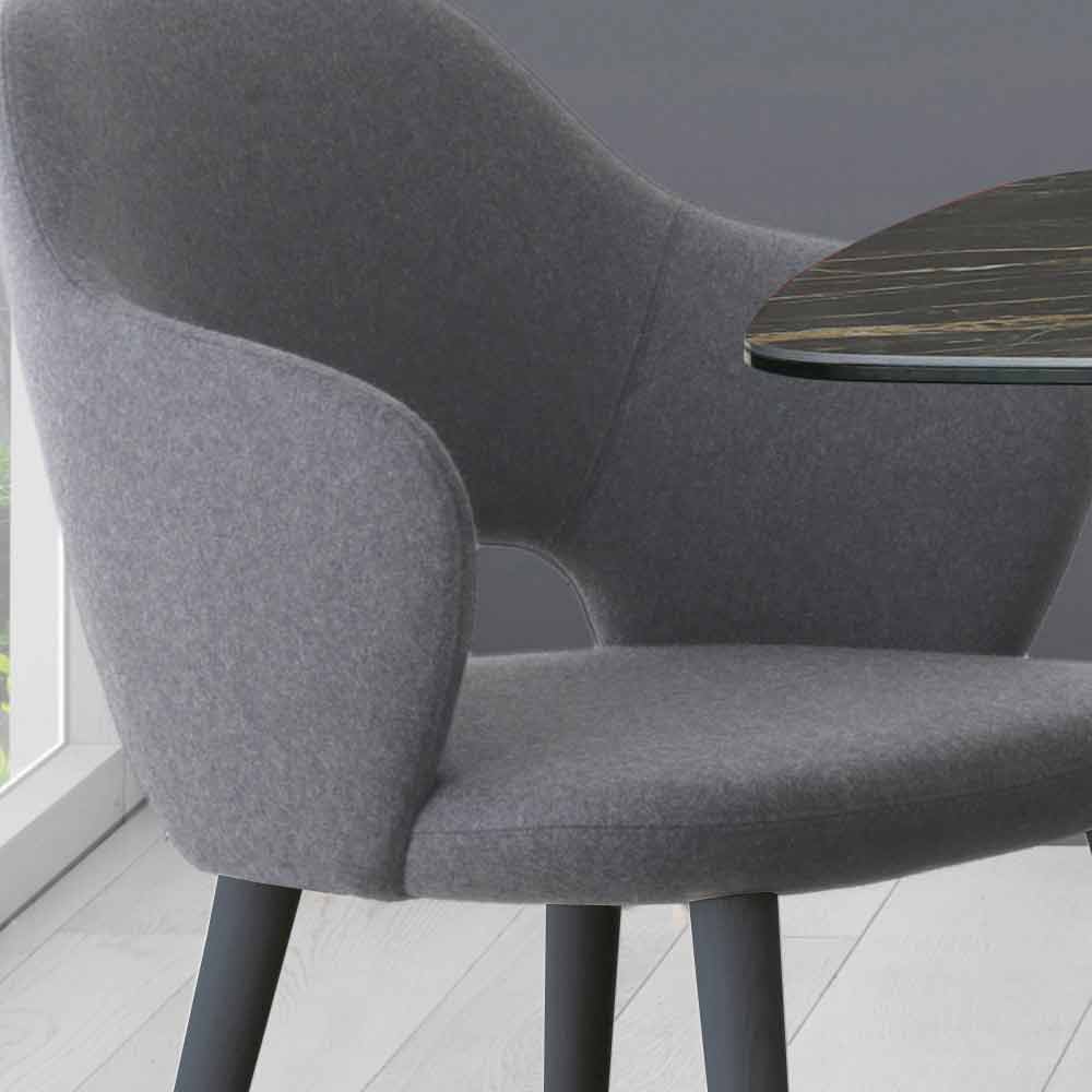 Scaun de bucătărie fabricat în Italia cu structură de corp din oțel, turnată în poliuretan spumat la rece acoperit cu țesătură și bază din lemn cu finisaj de frasin mat. O estetică cu atenție la detalii care se adaptează oricărei situații stilistice moderne, îmbogățind aspectul cu o atingere exclusivă și rafinată asigurând în același timp un loc primitor . O idee de mobilier modern și versatil, care vine din dorința de a crea un produs care poate spori bucuria de a găzdui și de a-ți împărtăși timpul datorită unui design confortabil și învăluitor .