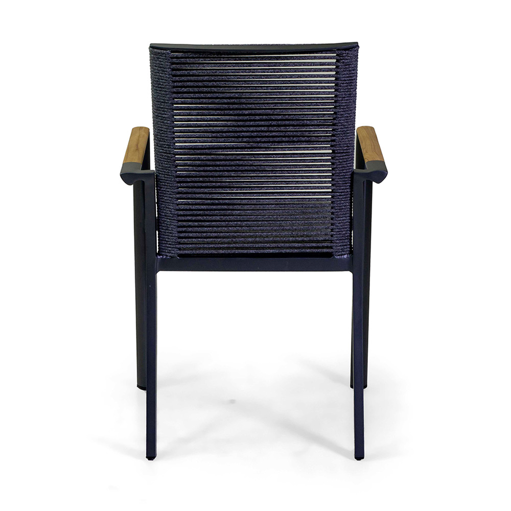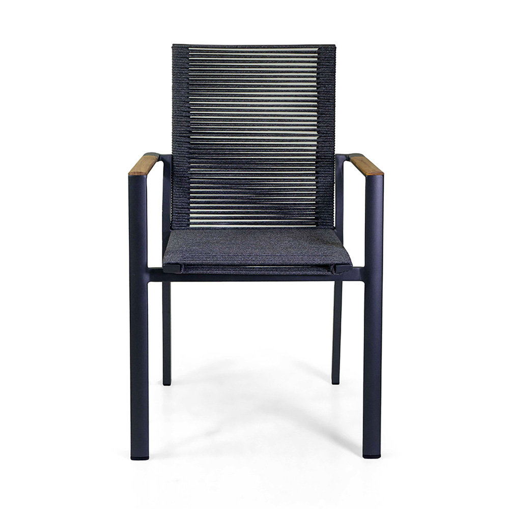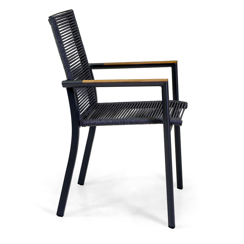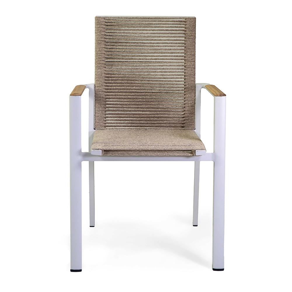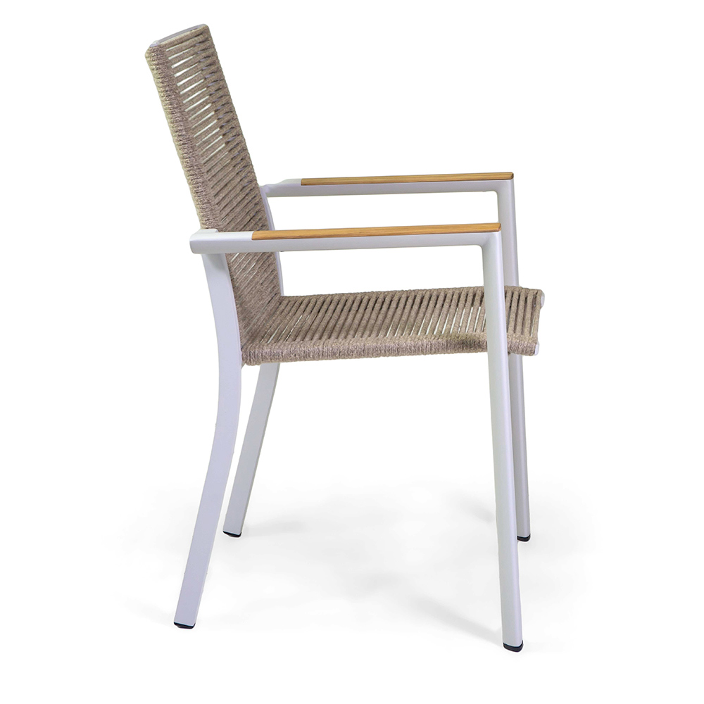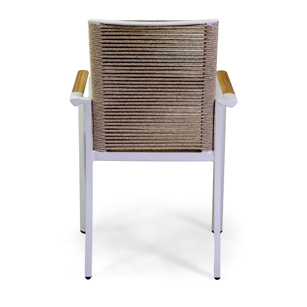 Descoperiți farmecul modern și confortul scaunului nostru de exterior . Cu un design elegant, contemporan, acest scaun combină rezistența aluminiului acoperit cu pudră cu frumusețea naturală a frânghiilor. Cotierele din lemn adaugă o notă de căldură și stil.