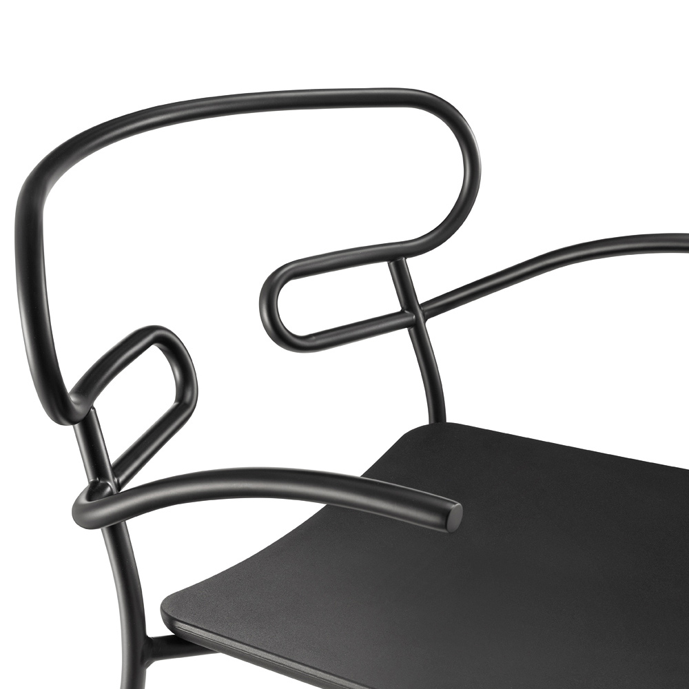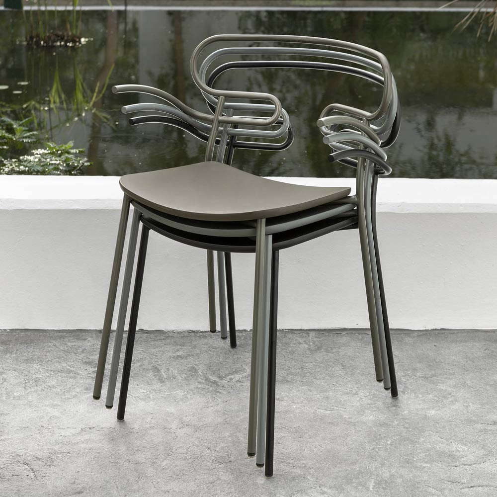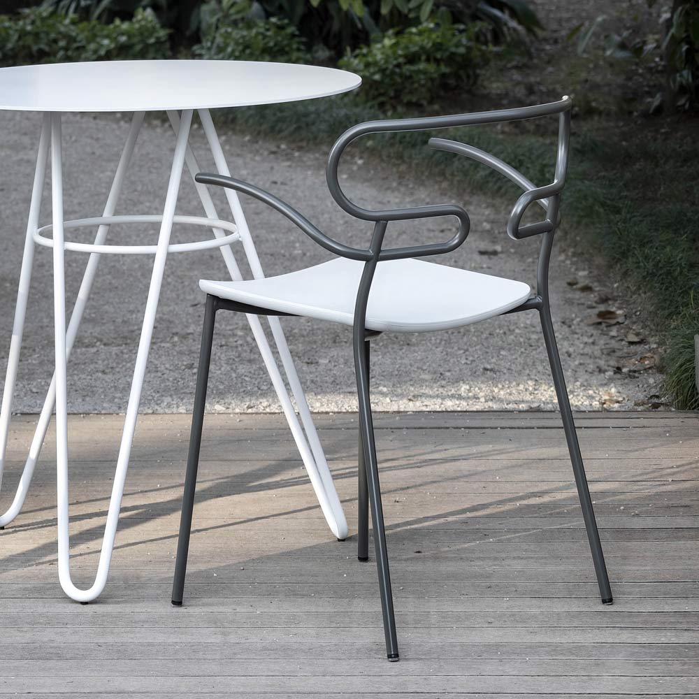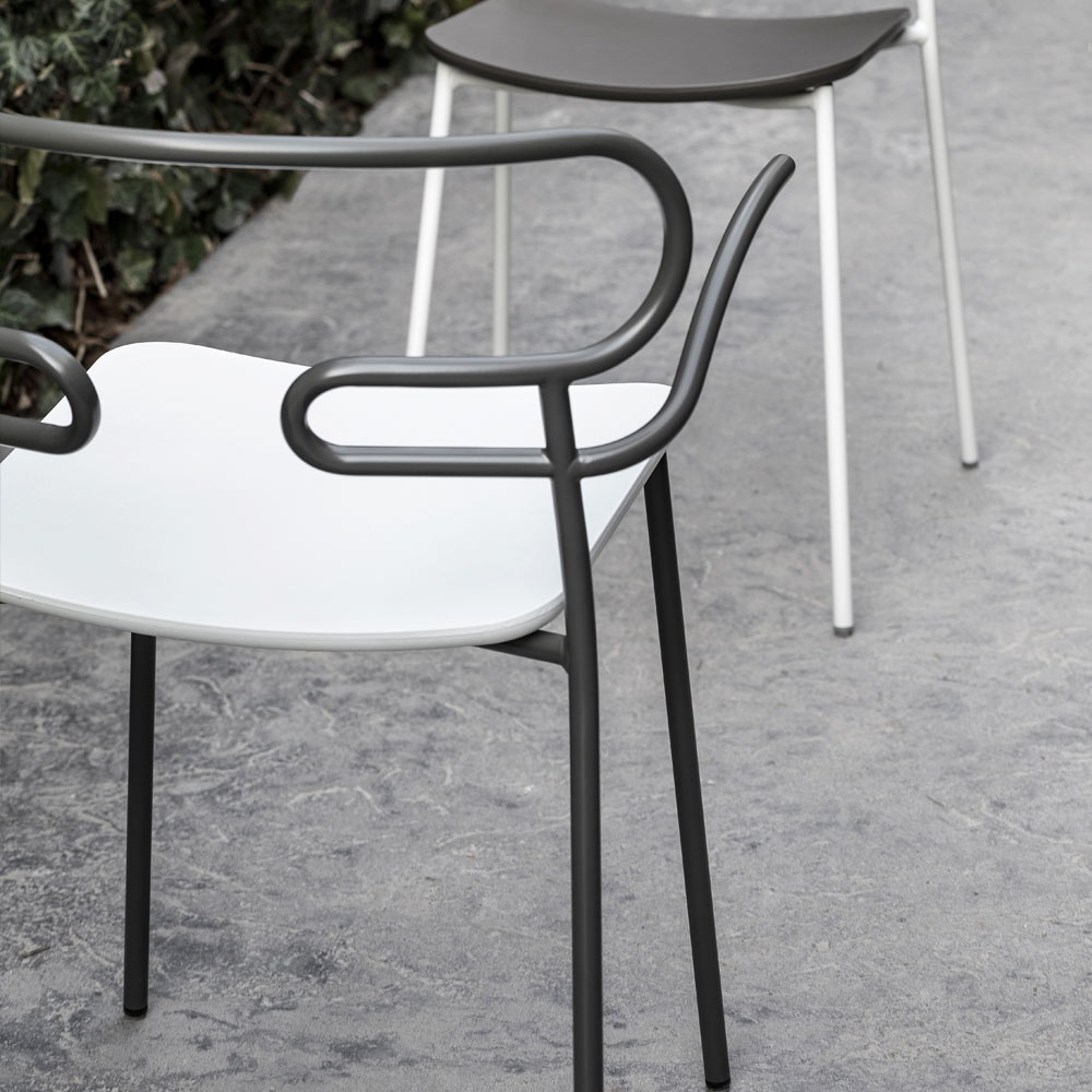 Scaun de exterior fabricat în Italia cu structură metalică vopsită și scaun din poliuretan. Simplu și esențial, acest complement iese în evidență datorită liniilor sale ușoare și formei speciale a spătarului obținută prin curbura unui singur tub metalic, creând astfel un design neobișnuit și avangardist. Ideal pentru decorarea zonelor exterioare cu personalitate precum grădini, verande și terase, are o caracteristică deosebit de funcțională, care este posibilitatea stivuirii pentru a obține o soluție practică și ușor de aranjat, optimizându-vă spațiile atunci când scaunele nu sunt utilizate.