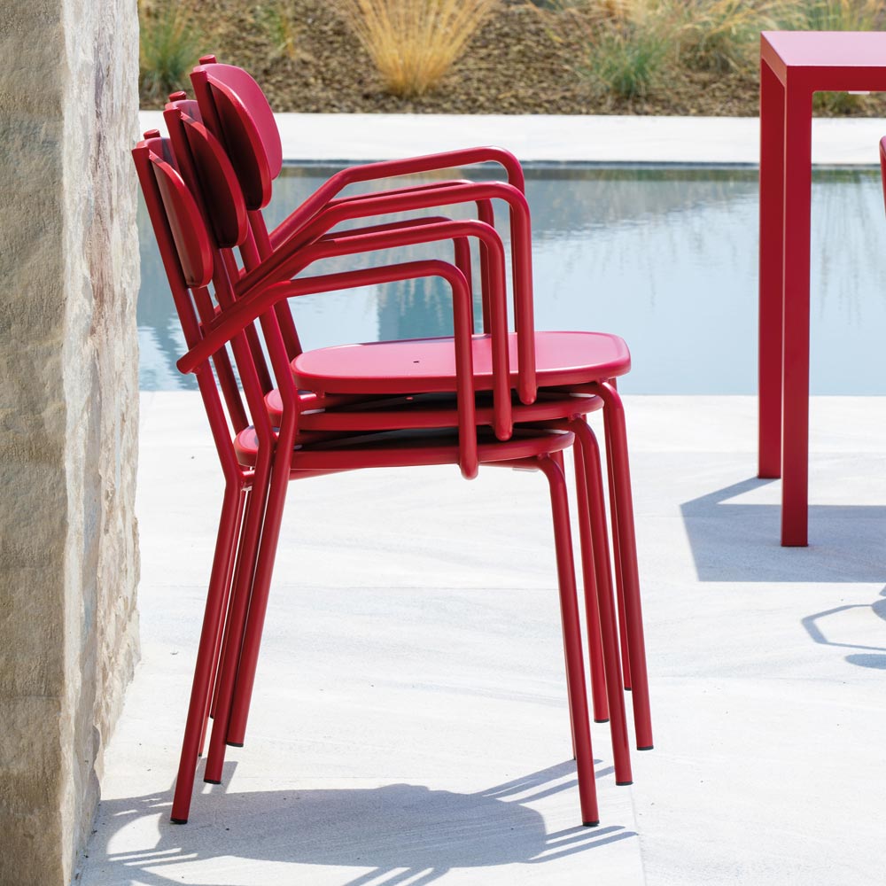 Scaun de exterior stivuibil din fontă galvanizată vopsită în câmp electrostatic, cu cotiere, fabricat în Italia, 4 bucăți.