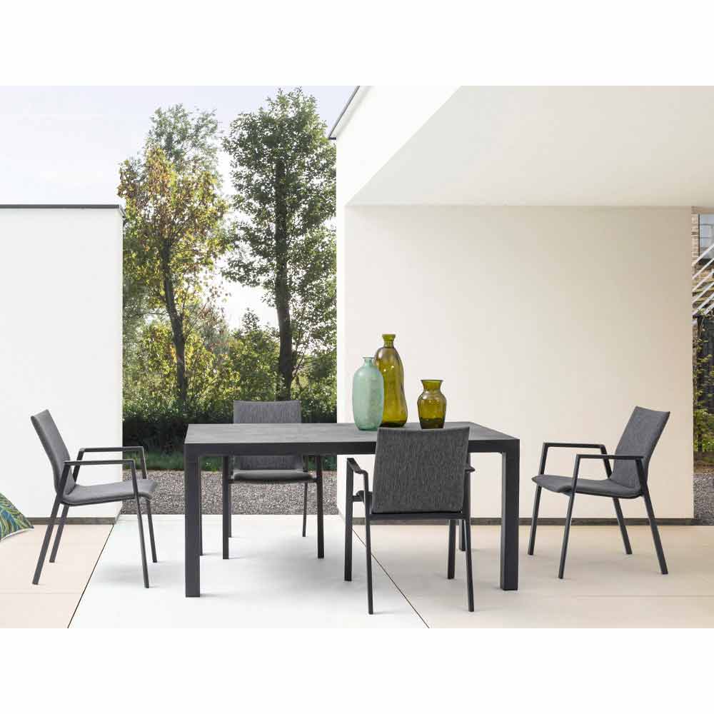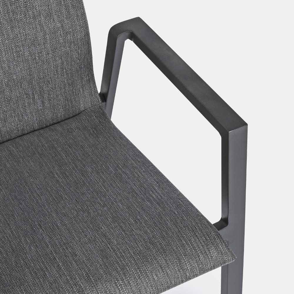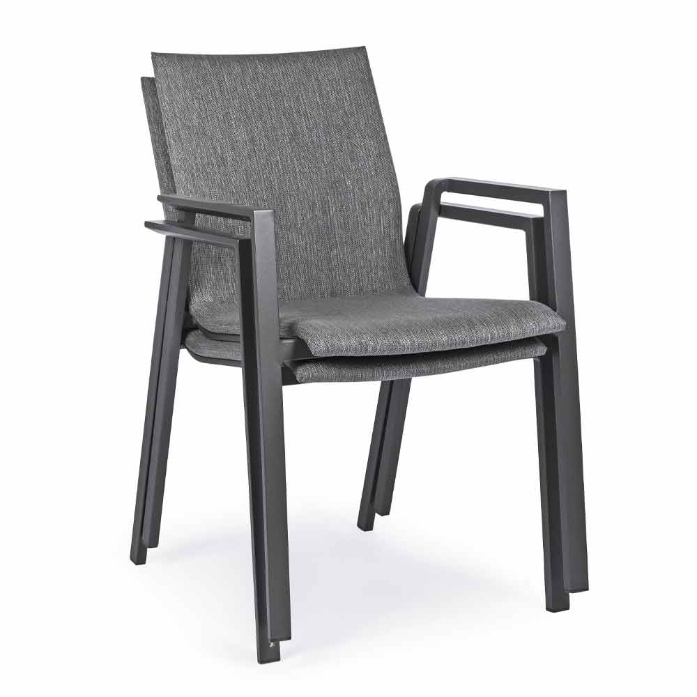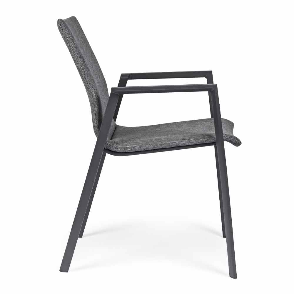 Structură din aluminiu acoperit cu pulbere (poliester). Tapițerie cu țesătură mixtă (70% textilenă, 30% olefină). Căptușeală rapidă cu spumă uscată pentru uz exterior. Stivuibil.