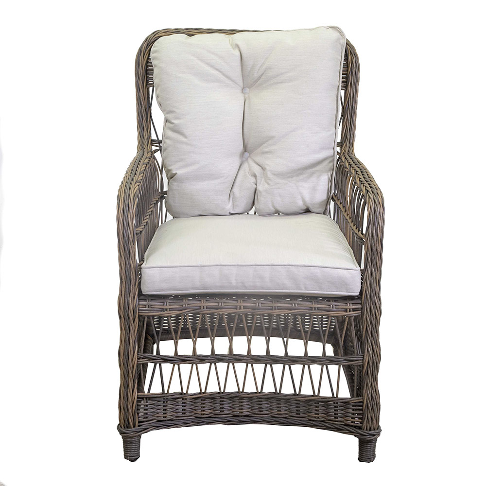 Culoarea neutră a poliratanului se potrivește perfect cu pernele moale și confortabile, îmbrăcate în țesătură rezistentă la intemperii, făcând acest fotoliu ideal pentru relaxare în grădină, pe terasă sau pe verandă.