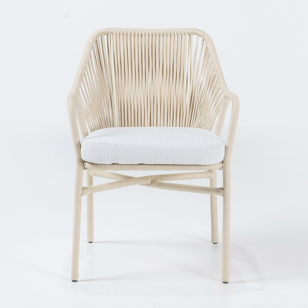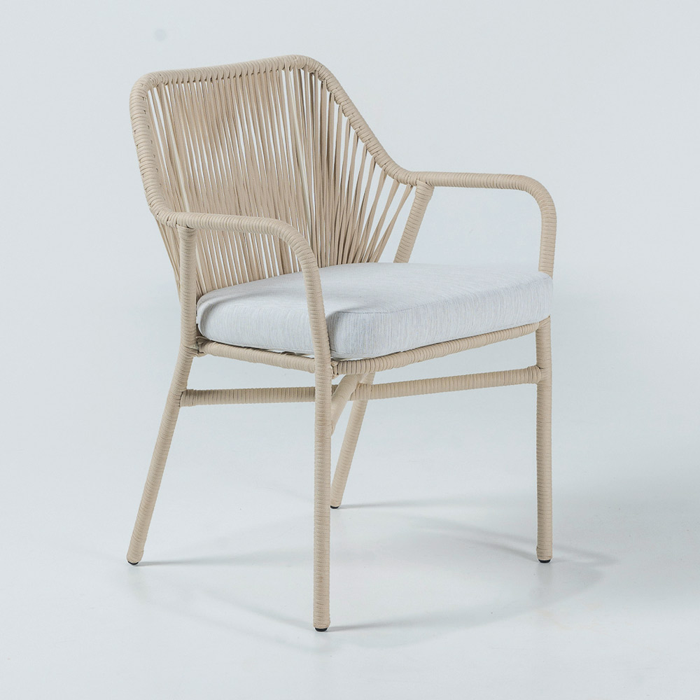 Fotoliu de exterior realizat cu cadru din aluminiu, țesătură din Olefin/PP ROPE și pernă de șezut din olefină în culoarea seriei "off white".