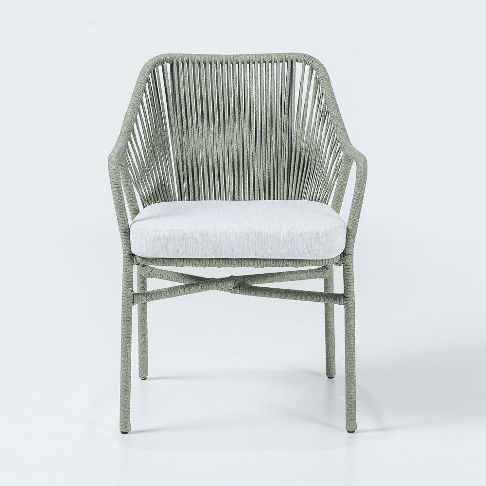 Acest fotoliu de grădină este un refugiu de relaxare, ideal pentru a te bucura de seninătatea spațiilor exterioare. Designul său este contemporan, cu o structură ușoară din frânghie țesută care creează un joc de transparență și umbre, adăugând profunzime și interes vizual grădinii sau terasei tale.