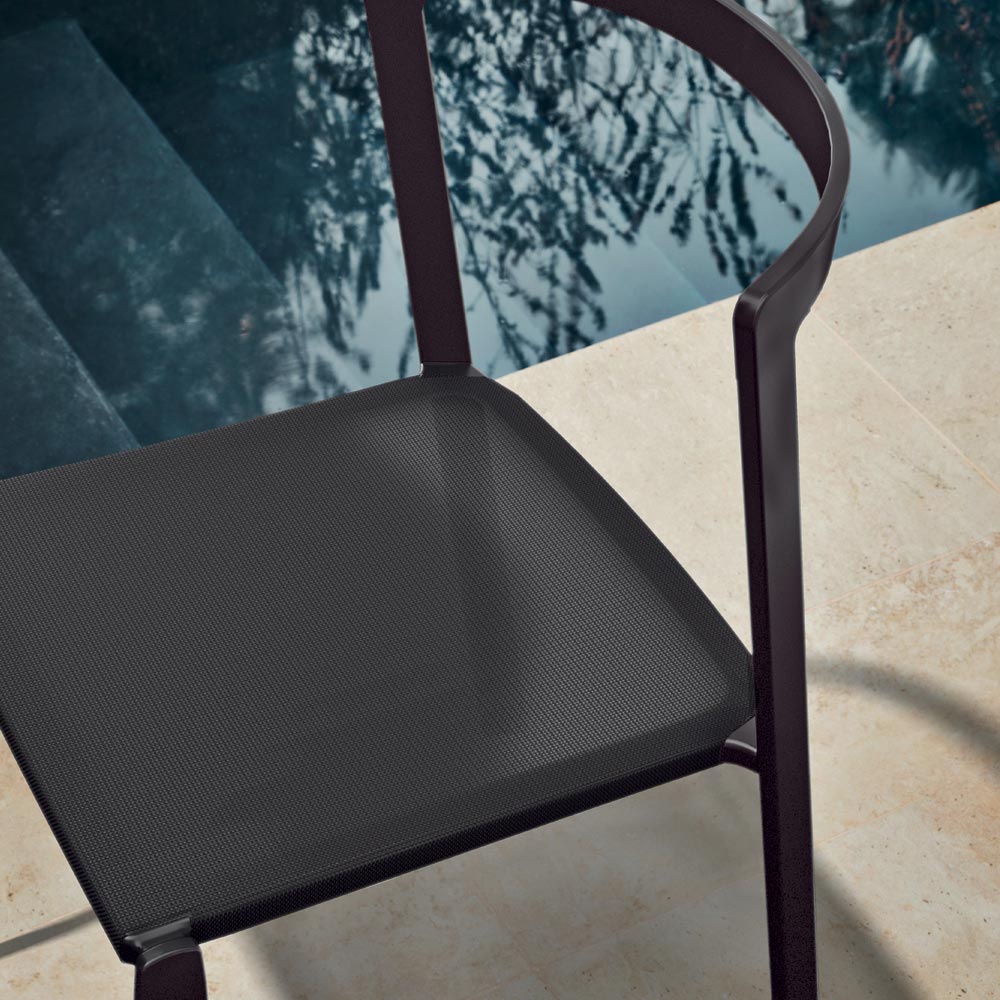 Scaun de gradina compus dintr-o structura din aluminiu vopsit si sezut imbracat in textilena colorata, fabricat in Italia . Combinația de linii sinuoase și forme moi creează un efect vizual minunat capabil să îmbunătățească atât mediul extern, cât și cel intern.