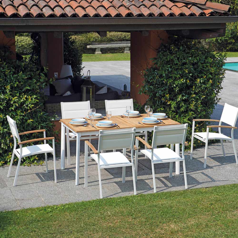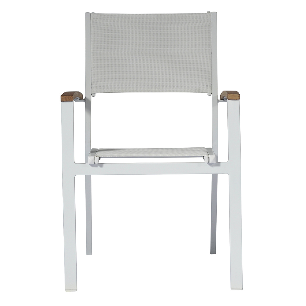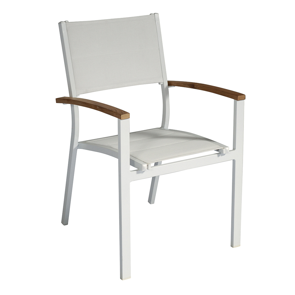 Scaun de exterior stivuibil cu structura din aluminiu si sezut din textilena captusita ivoire imbogatita de cotiere elegante din lemn de tec . Acest scaun de exterior îmbină designul și simplitatea , rezultatul unor materiale simple, dar rezistente, care dau viață unui produs cu un design original și avangardist, perfect pentru a completa orice mediu.