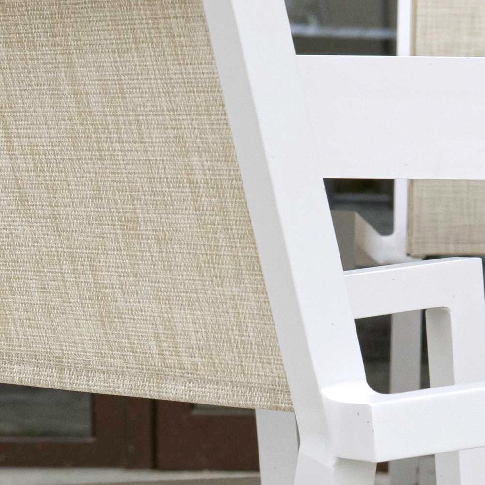 Structura rezistentă din aluminiu alb mat garantează durabilitate și rezistență la intemperii, menținându-și frumusețea în timp. Învelișul din textilenă bej nu numai că adaugă o notă de clasă prin textura sa rafinată, dar oferă și un confort imbatabil datorită elasticității și respirabilității sale.