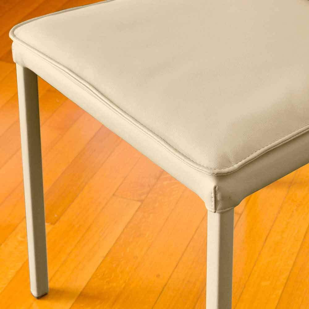 Scaunul modern Bessie este acoperit cu imitație de foc, clasa 1 IM , moale și maleabilă. Rezistent la frecare și uzură, este realizat folosind o bază de bumbac și un strat sintetic care reproduce efectul pielii, cu un finisaj elegant și cu referințe de epocă, respectând în totalitate animalele.