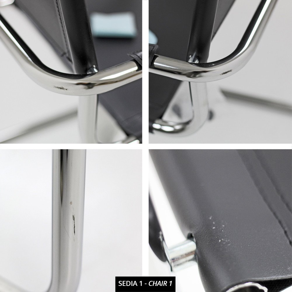 Scaun modern pentru sală de ședințe sau de conferințe, din metal cromat și piele sintetică neagră.